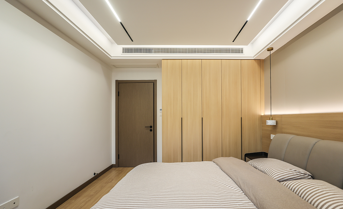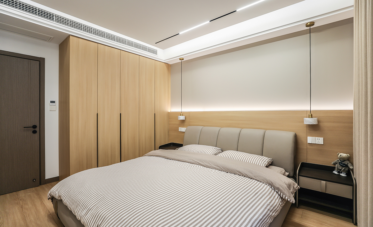 主臥地面鋪的實木復合地板,背景墻選了現在比較流行的硬包+原木色墻板,柔和的色調,半墻造型點綴燈帶線,讓家里氛圍感更純粹。皮革硬包+原木色木飾面+燈帶,見光不見燈,美觀又大方。頂上采用懸浮無主燈+線性燈,配上兩邊的吊燈,整個空間層次明細,整體效果突出,配上咖啡色的窗簾和白沙,更大氣,時尚。