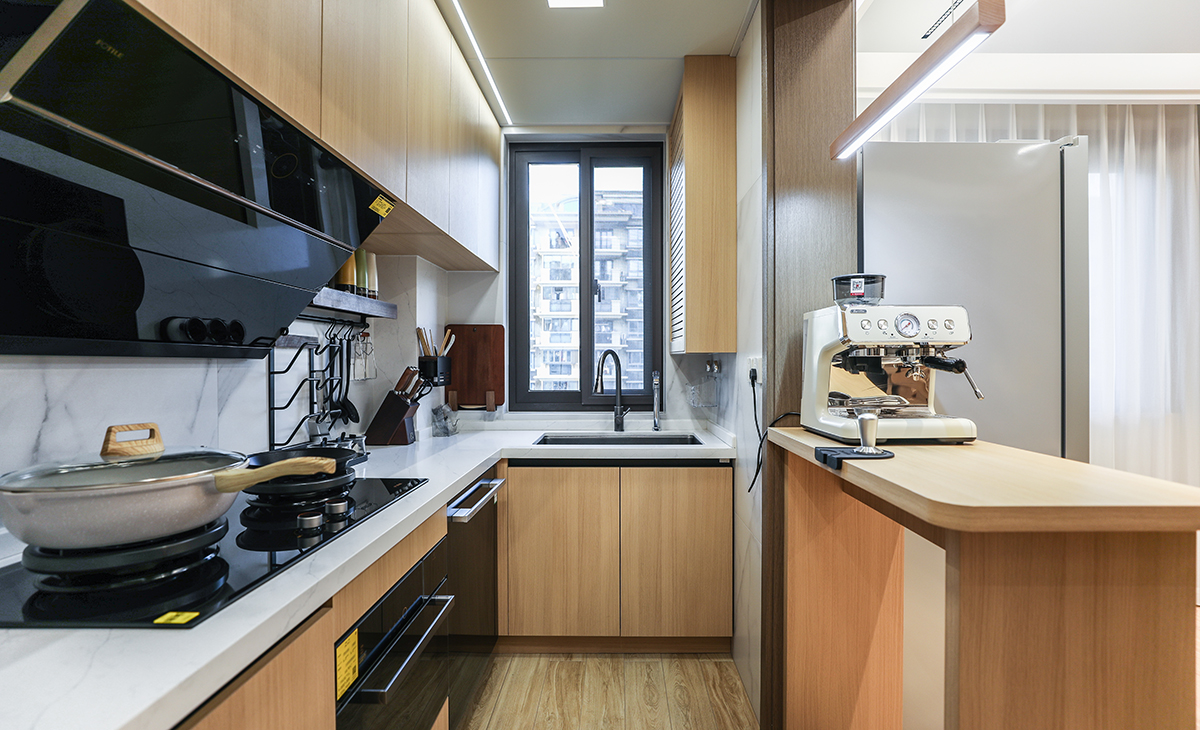 廚房間本來是長方形封閉式的空間,改成開放式的廚房,配上吧臺,L型櫥柜整體采用原木色門板,配上白色的臺面,整體干凈、簡潔,地面用的木紋磚,與廚柜門板和吧臺顏色統一,頂面采用現在流行的大板吊頂配上線性燈,時尚、溫馨。