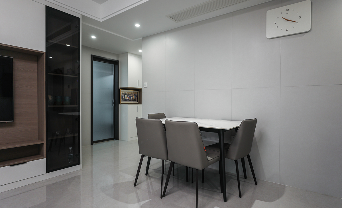 餐廳空間空間不大,80*130的餐桌靠墻放,餐廳的墻面用60*120的柔冠磚鋪貼,美觀又好打理。