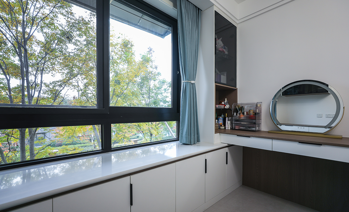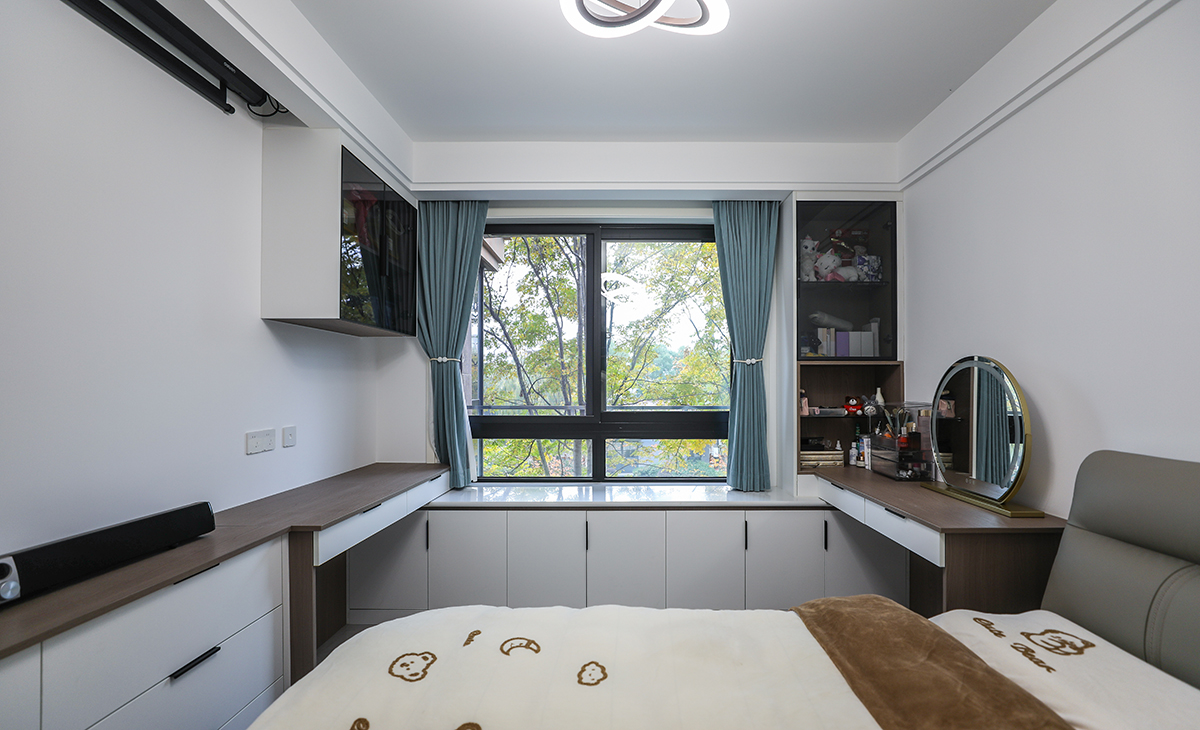 主臥簡約的床頭背景,將梳妝臺和新做的飄窗柜連起來,既增加了儲物空間又實用。