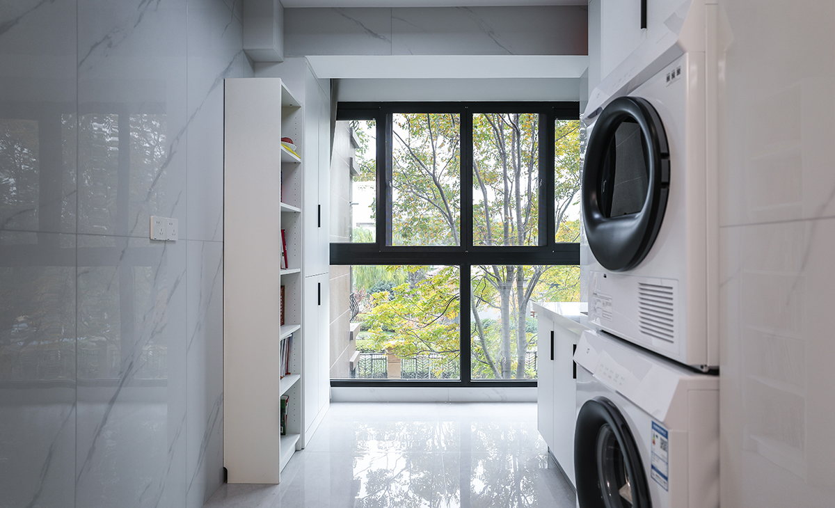 陽臺是晾曬衣物的場所,洗衣機和烘干機疊放旁邊放水槽,上方為儲物柜,顏色以米白色為主大玻璃窗讓陽光柔和的照進來,很舒適、很愜意。