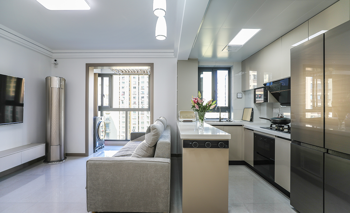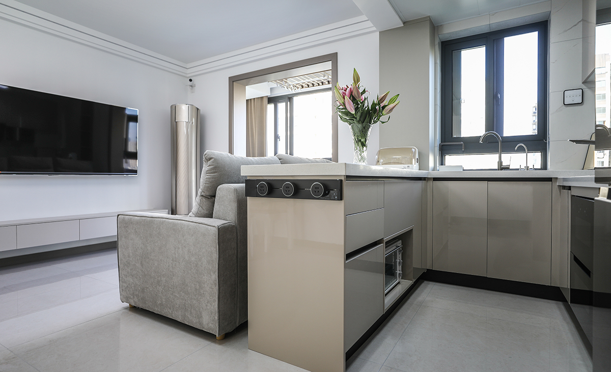 該套房子廚房空間很大,U型兩面櫥柜,另外冰箱邊上也有操作臺,顏色簡潔明快,材質要干凈和好打理,白色的吊頂和米色的櫥柜相呼應,石英石臺面經久耐用,各種廚房電器全部配齊,滿足主人制作各種美食的需求。