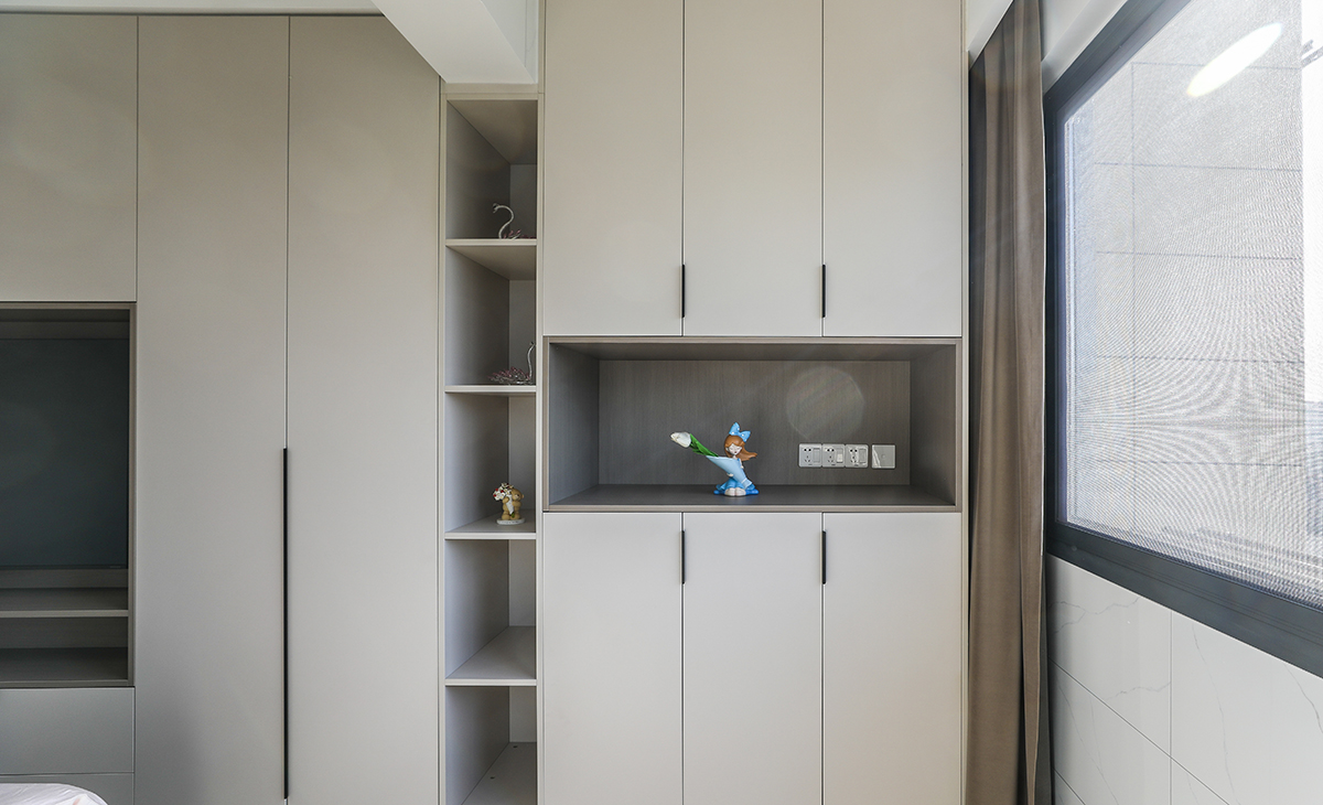 次臥另一邊采用衣帽柜和裝飾柜集合,增加空間的儲物,采用二扇玻璃門板增加空間的氛圍感,讓空間更加溫馨,墻面采用淺粉色墻面乳膠漆,頂面白色乳膠漆,既簡單又實用。