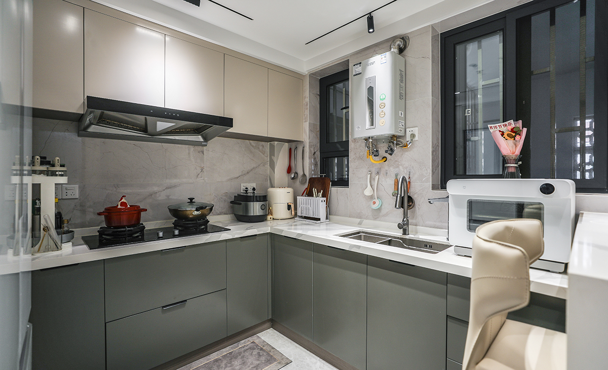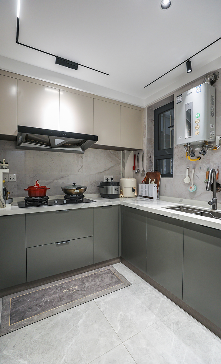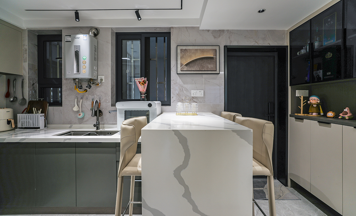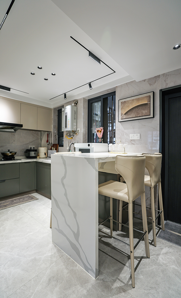 廚房U字型廚柜加島臺設(shè)計,滿足了取、洗、切、炒、擺的操作流程。使小小的廚房的收納空間也大大提升。