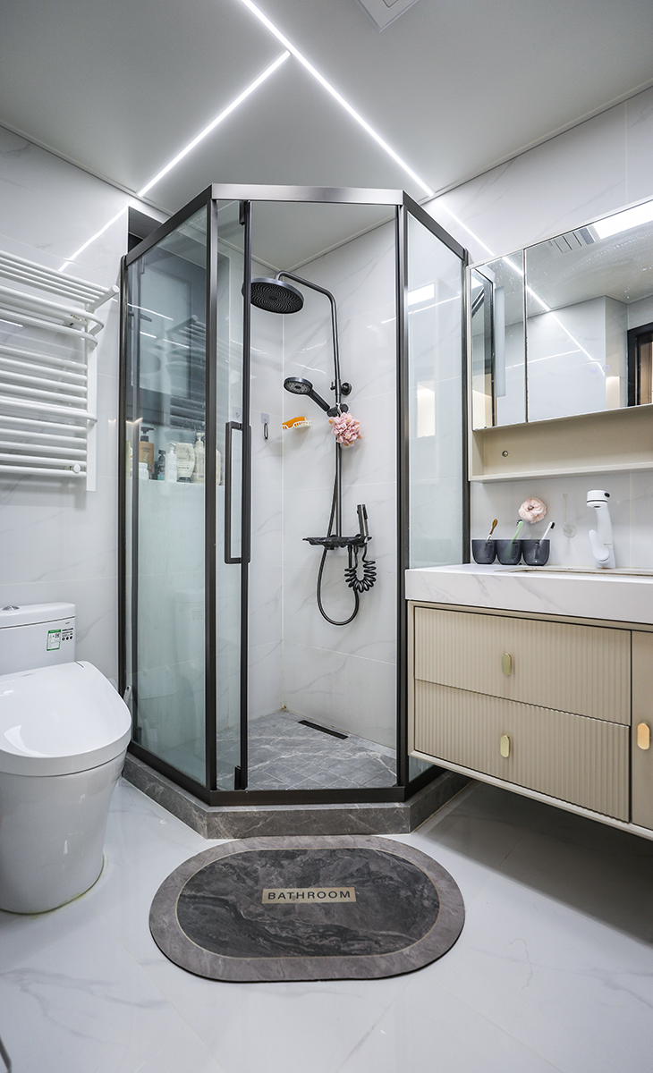 衛(wèi)生間里容易積聚潮氣,所以通風(fēng)特別關(guān)鍵。鉆石形淋浴房靠窗擺放,兩側(cè)分別放置馬桶、臺盆。小衛(wèi)生間要把活動空間集中在一起,讓動線變的更流暢。