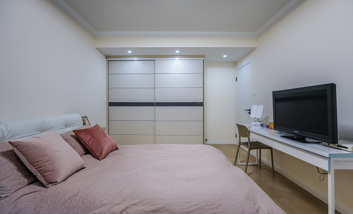 一對退休付夫婦帶著一個女兒居住,女兒是平時工作比較忙經常出差,基本不會在家辦公,因此她的房間只需要簡單寬敞就行,對于儲物的需求不大,但是需要做書柜,平時比較喜歡看書,次臥室是老人住沒有特別的需求常規布置,客餐廳客戶要求只保留客廳即可,男主中風剛好需要做康復訓練每天自己在家多走動所以取消了餐桌,餐桌放到了廚房間,因此客廳呈現的感覺就是簡潔大氣。