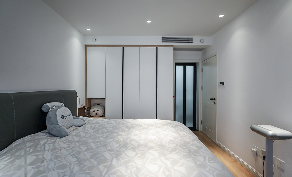 主臥也是無主燈的設(shè)計,主打就是簡潔,地面原木地板,床選擇了灰色的皮床,簡單的原木床頭柜,空間非常溫馨。