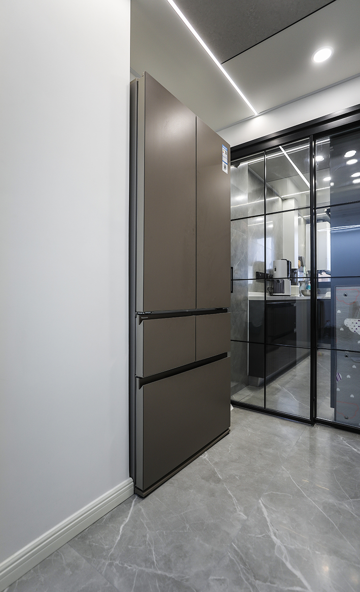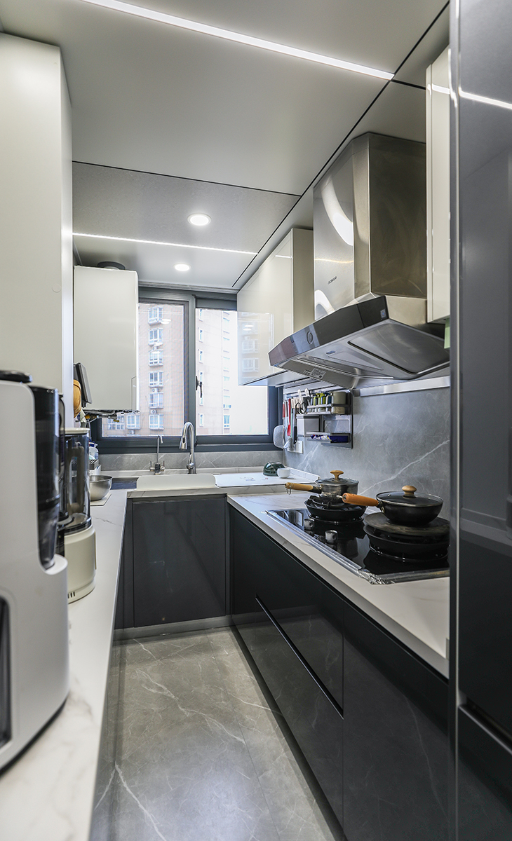 廚房間整體空間不大,業(yè)主對操作臺面要求很高,因此兩面都進(jìn)行了利用,上下櫥柜也選用了上白下灰的拼色處理,空間感覺也更加活躍,臺面選用了2公分的魚肚白石英石,使用起來方便也好打理。
