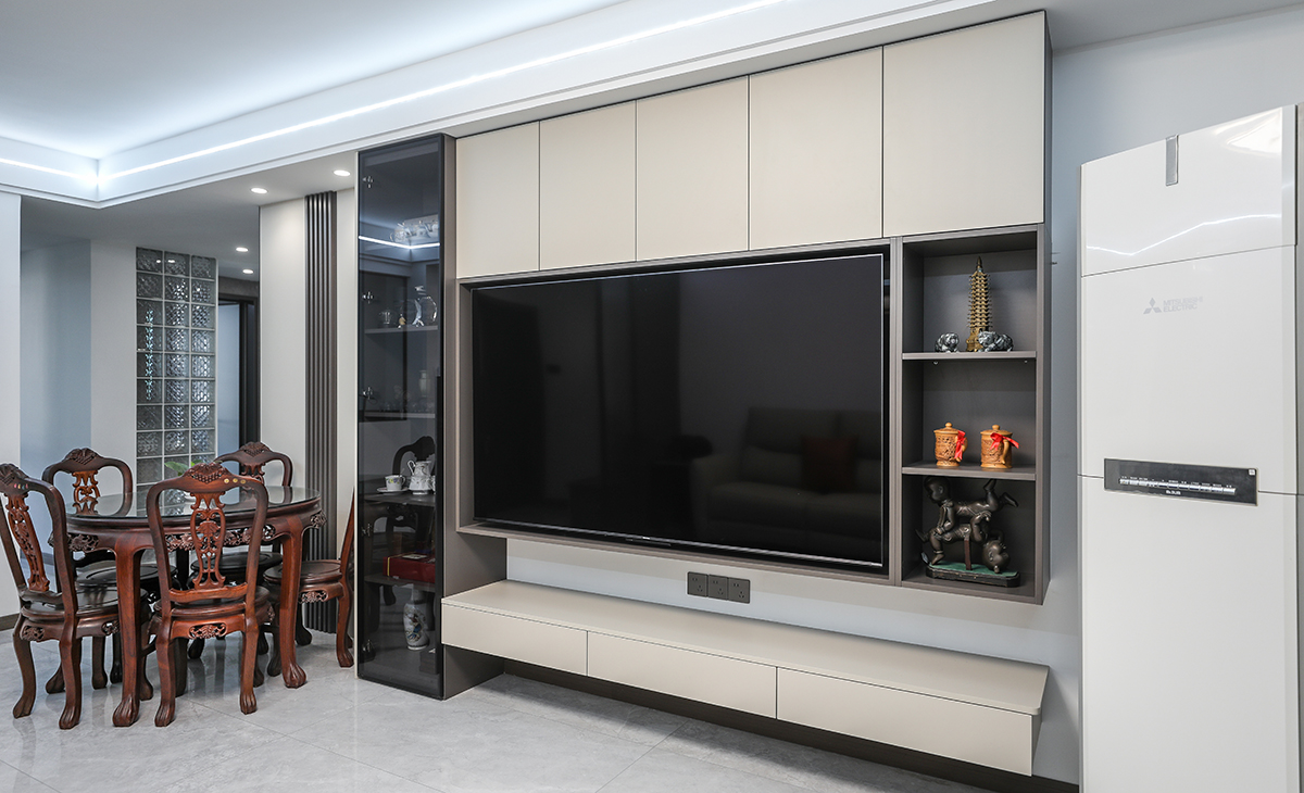 餐廳和客廳融合一體,沒有明確劃分空間,擺放一張紅木圓桌,古典與現代結合。