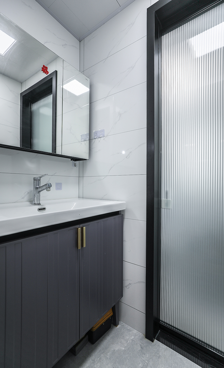 主衛空間并不大,淋浴區以浴簾代替隔斷,智能馬桶,墻地一體磚、白色吊頂,鈦合金移門,體現主人高檔次的生活品味和優雅的審美觀。