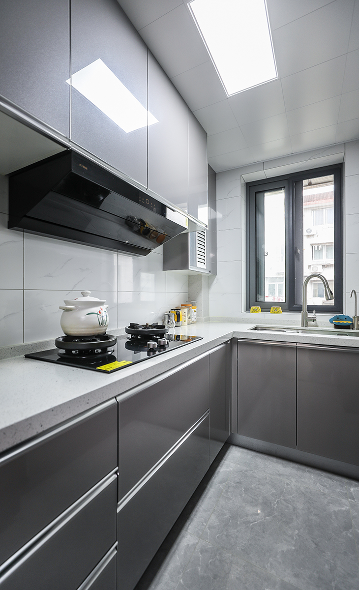 該套房子廚房空間很大,U型兩面櫥柜,另外冰箱邊上也有操作臺,顏色簡潔明快,材質要干凈和好打理,白色的吊頂和灰色的櫥柜相呼應,石英石臺面經久耐用,各種廚房電器全部配齊,滿足主人制作各種美食的需求。