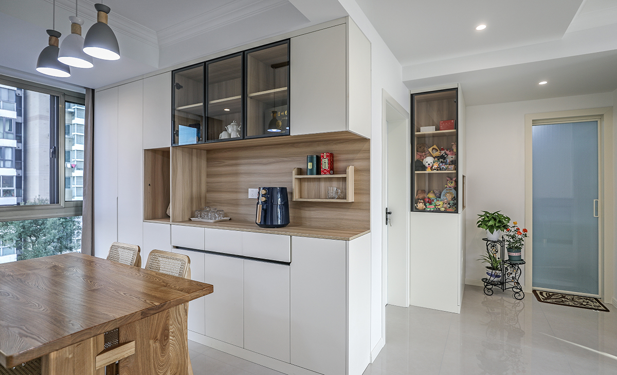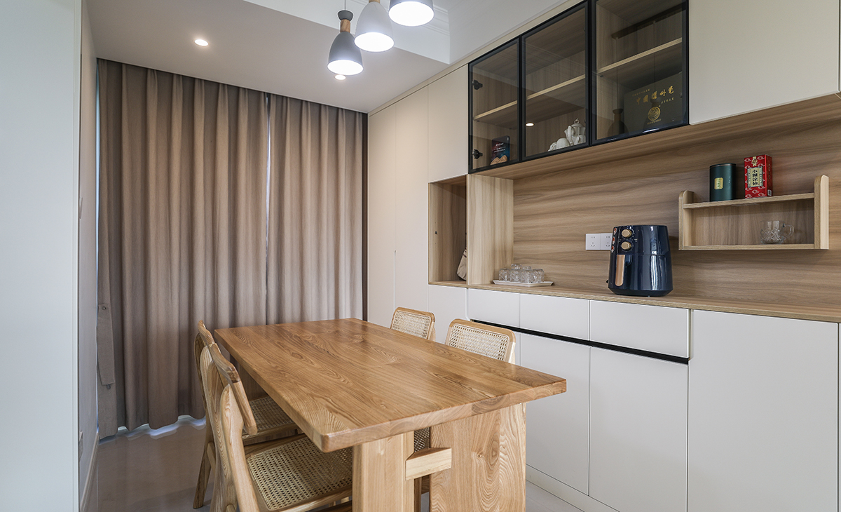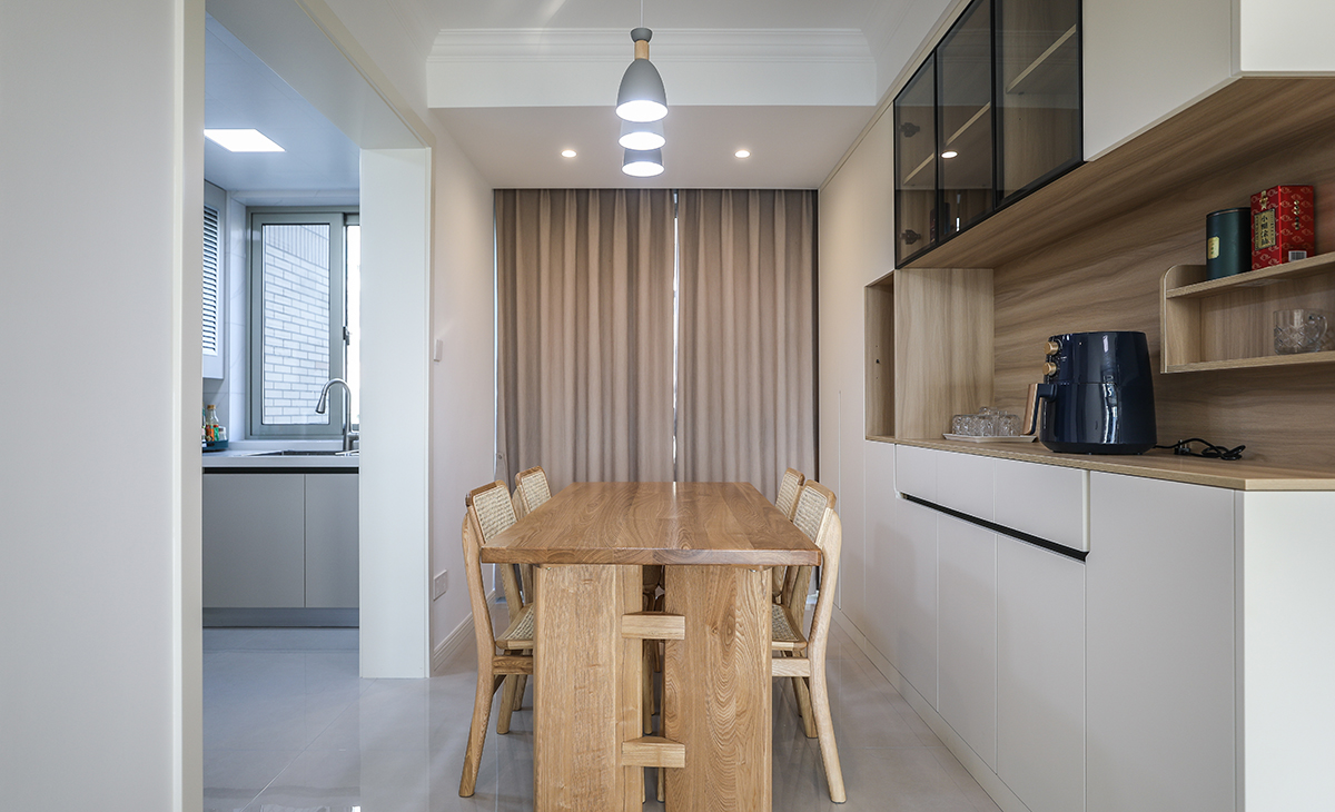 原木色餐廳餐桌搭配餐邊柜,既實用、又有裝飾功能,頂上吊燈增加氛圍感,地面同客廳地磚通鋪,整體色彩和造型上都簡潔大氣舒適。
