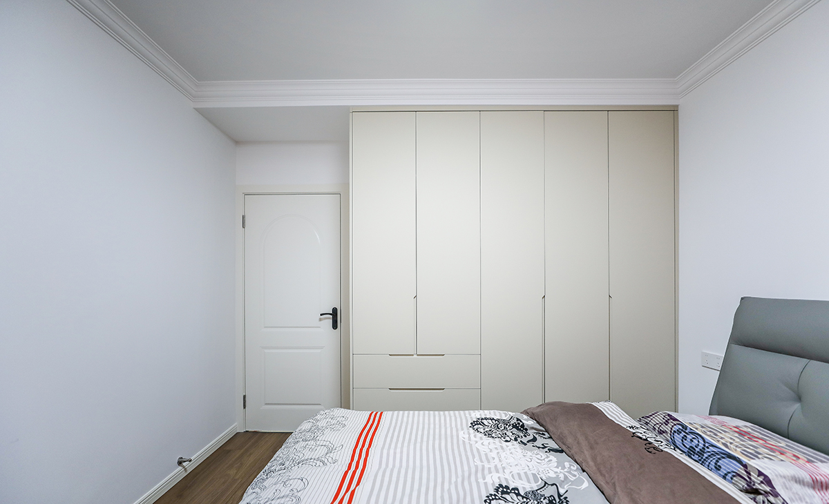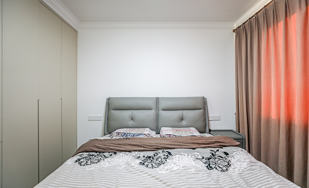主臥增加儲藏,既美觀又實用,顏色上深淺搭配地錯落有致,橡木色地板,墻面暖白色干凈清爽,頂面白色乳膠漆,輕巧時尚的吸頂燈,空間很溫馨和諧。