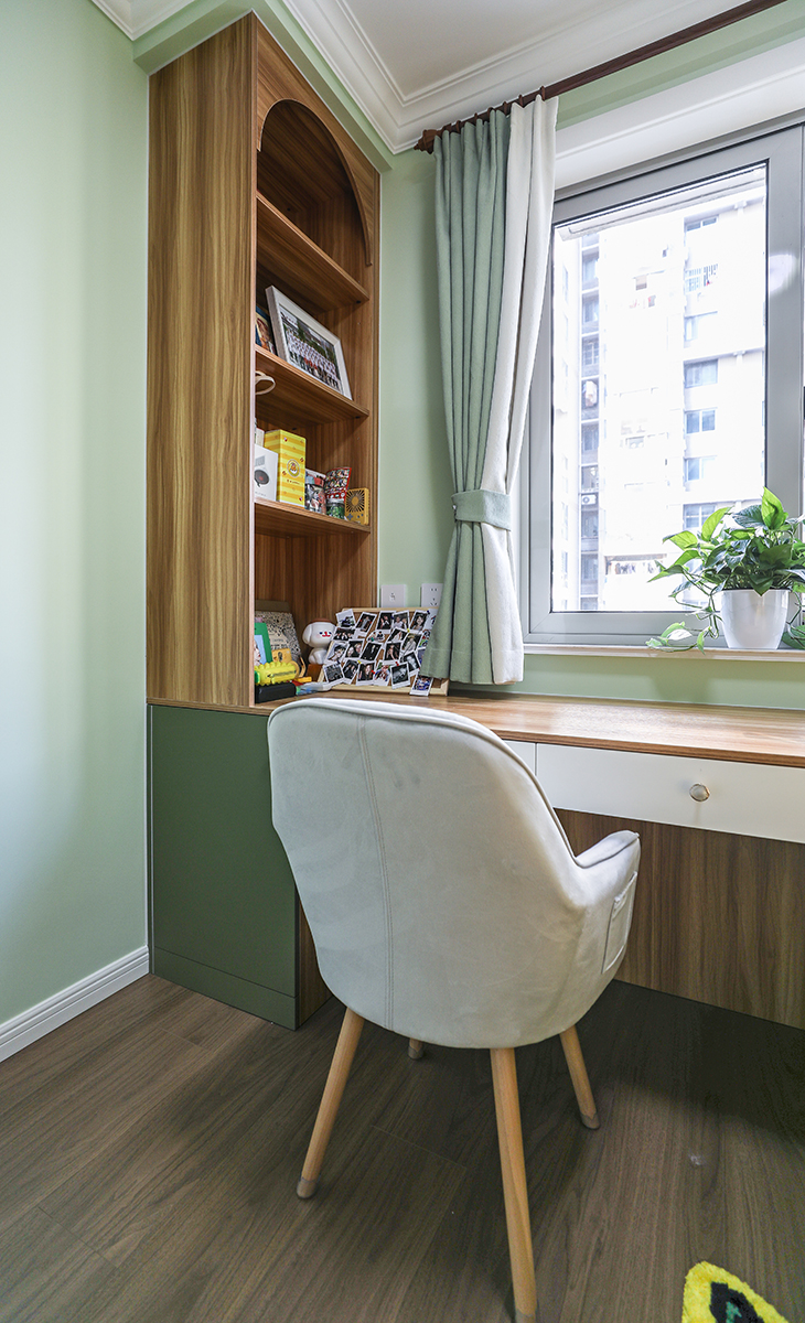 次臥是女兒房,色彩非常的跳躍,體現女主人的活力與激情。電腦桌,書柜,衣柜應有盡有,讓子女也有一個屬于自己的空間。