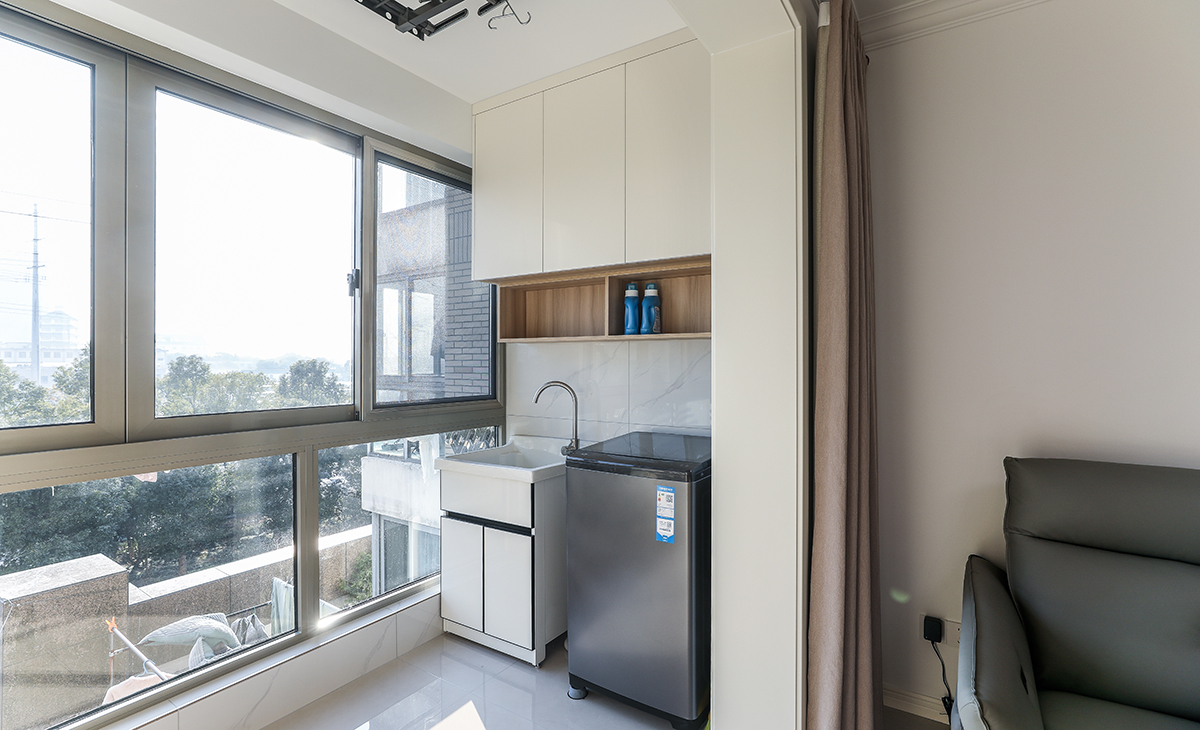 該套房子廚房空間利用非常合理,L字型二面櫥柜,顏色簡潔明快,亮色的材質干凈也好打理。頂面采用鋁扣板吊頂,配上涼霸,天氣炎熱的夏天也能在廚房愉快的烹飪,現代化的廚房是家庭裝修的重要組成部分,是制作食品的場所,光線充足,通風量好,環境潔凈和使用方便是廚房裝修的基本要求。