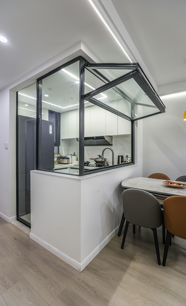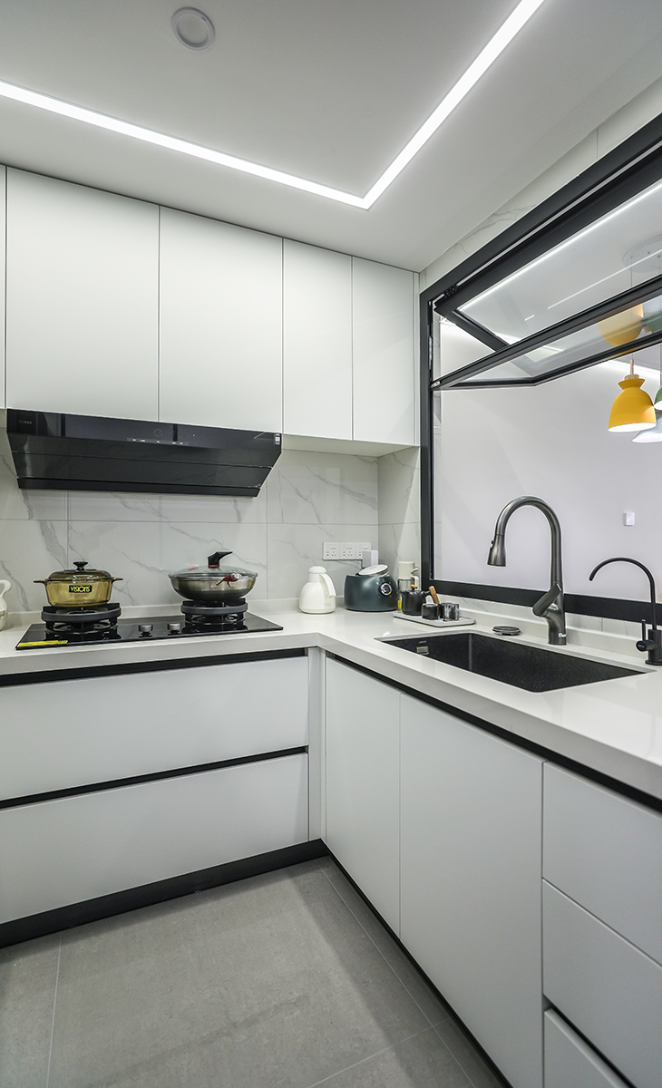 房半開放式設計,滿足了取、洗、切、炒、擺的操作流程。更讓煮飯時和家人有更多的互動空間,同時使小小的廚房的收納空間也大大提升