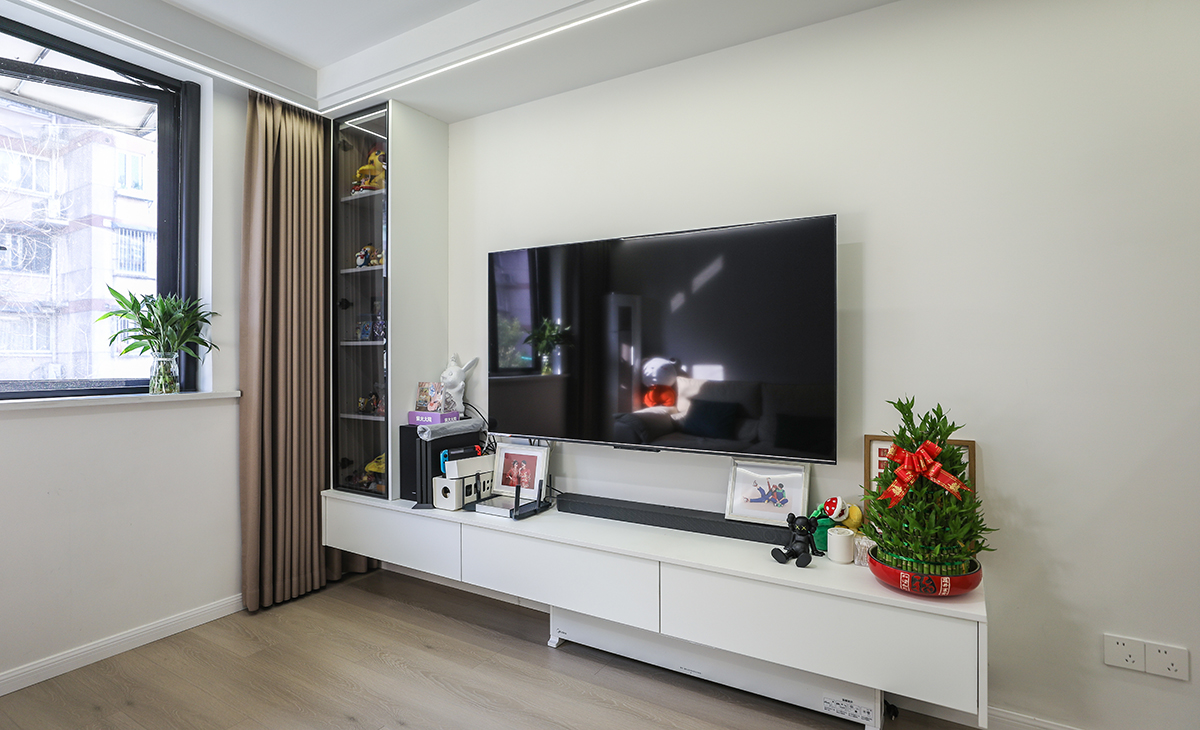 進戶的落塵區(玄關區)有效的增加了進門放鞋子以及鞋柜對面隱藏式的掛衣區,因為空間結構問題,掛衣區旁邊增加一個雜物間,并做隱形門設計。