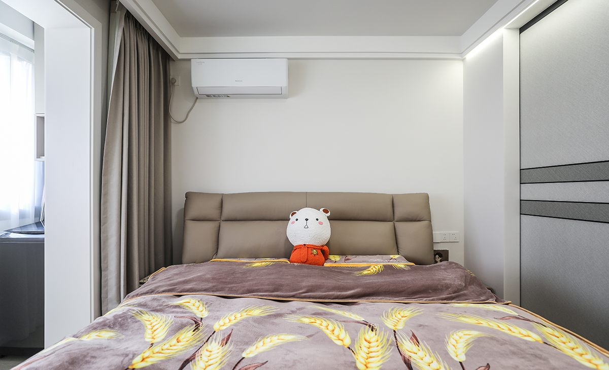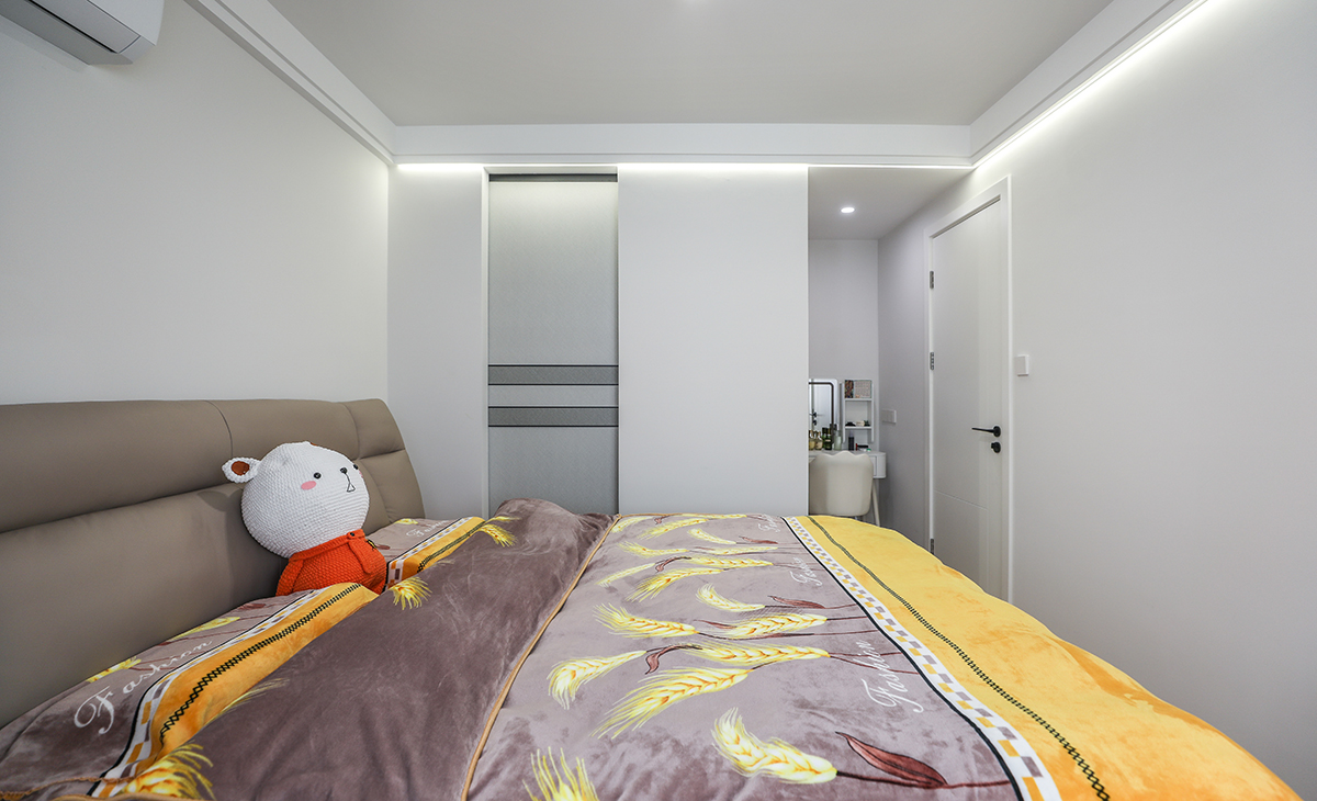 簡約的空間布局,頂面的雙眼皮走邊以及局部線性燈裝飾,做到了見光不見燈的設計效果,臥室增加衣帽間和專屬化妝區,即解決了儲物問題,又讓空間動線變得更加合理。