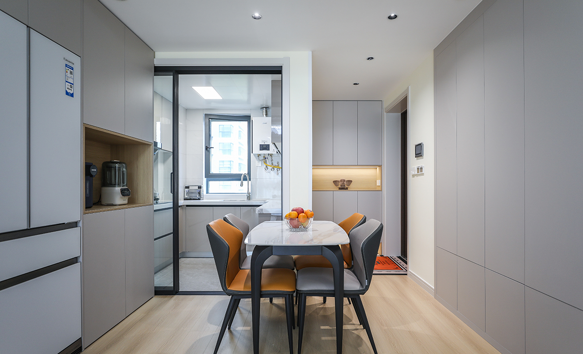 餐邊柜采用組合柜形式,0嵌的卡薩帝冰箱搭配鏤空的電器臺面,咖啡機,榨汁機等,1300*650的餐桌,平時家里只有2-3個人吃飯,夠主人用,白色巖板臺面,黑色餐桌腳,愛馬仕橙的椅子,搭配上方筒燈,靈活輕巧。