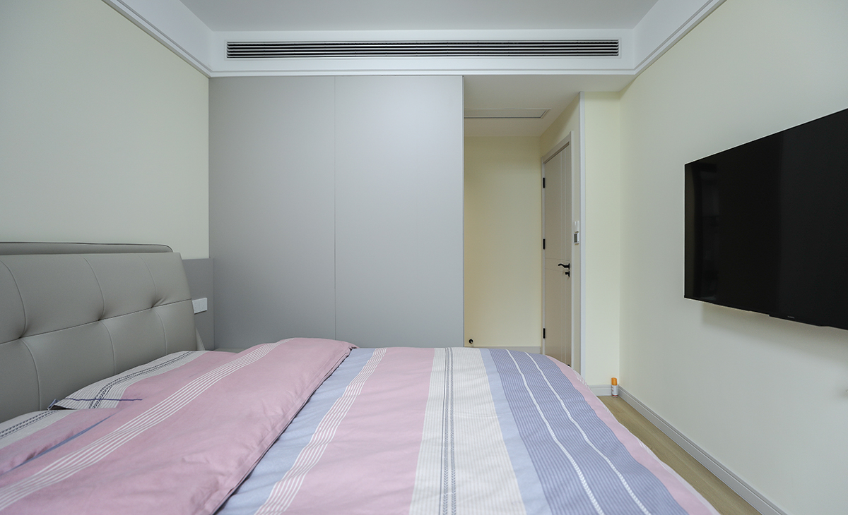 主臥奶黃色床頭背景,搭配墻板背景,奶咖窗簾+白色沙簾,造型以簡潔平板為主,方便打理,體現了北歐的溫馨、舒適,不拘一格。