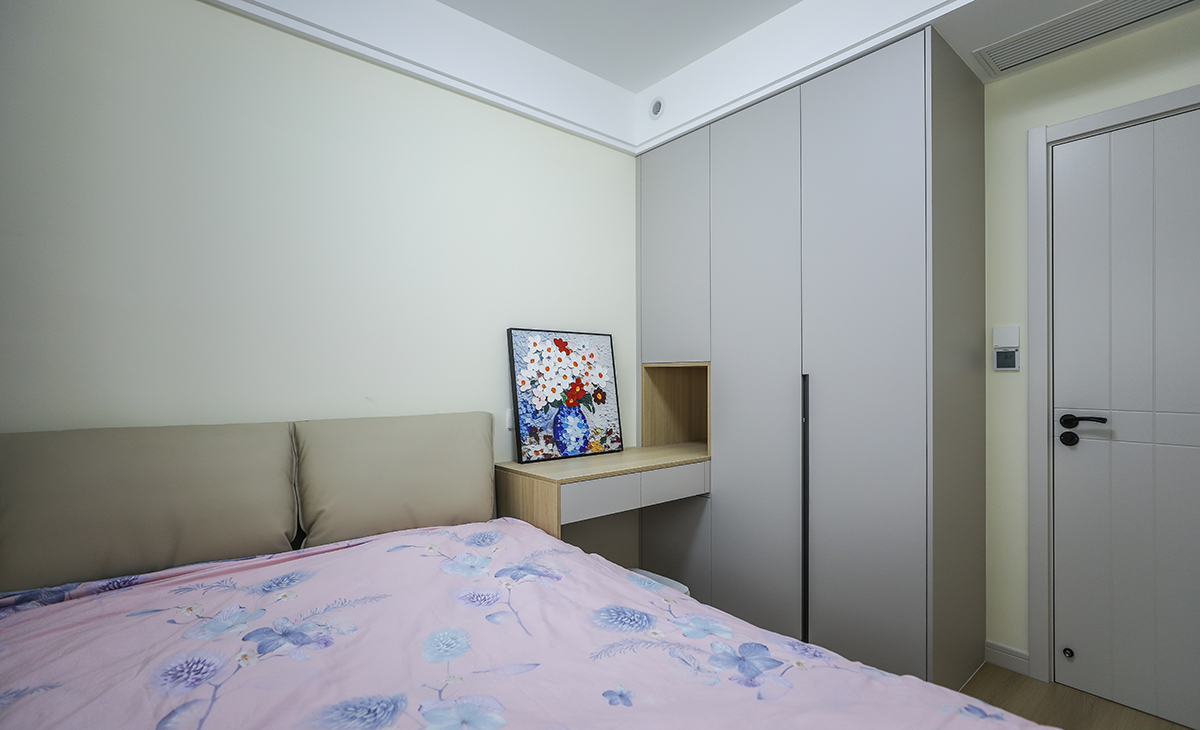 次臥采用衣柜組合書桌兩位一體設計,讓8個平方的次臥空間很寬敞,不到擁擠,顏色深淺有序,很溫馨,舒適、給人感覺不僅雅致而且有韻味。