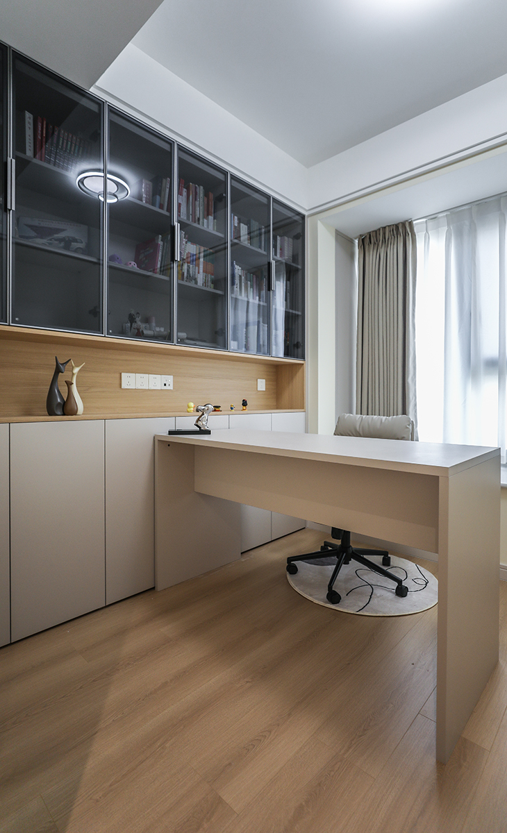 書房上面采用灰玻,中間鏤空放置打印機等小電器,可移動式書桌給整個空間增加了更多的活動可能性,閱讀累了坐在飄窗上喝喝茶看看風景。