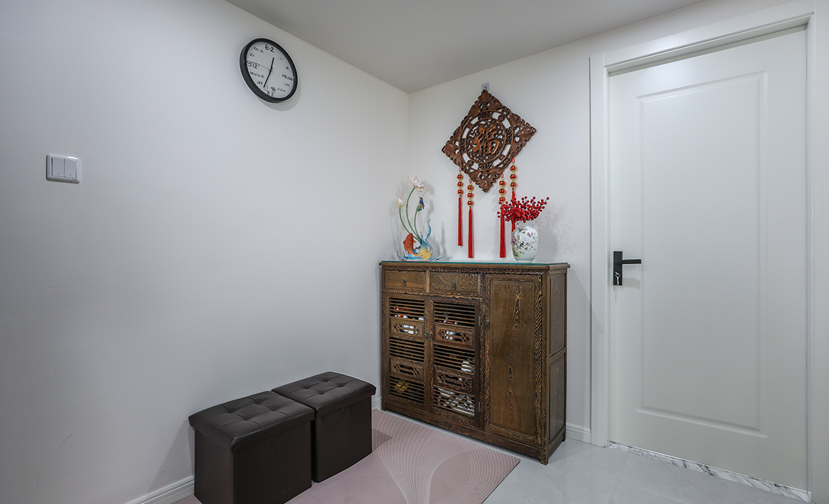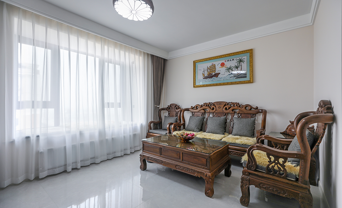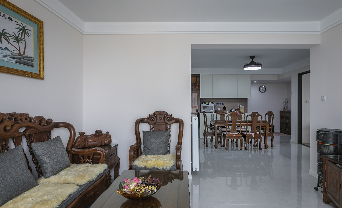 客廳開間很大,客戶家里實木家具是原先保留下來的,雞翅木質感強硬,跟客戶雍容華貴的身份相吻合??蛷d空間也很寬闊。吊頂造型上采用雙眼皮吊頂。地面采用淺灰色地磚。造型和色調上無不給人以簡潔、大氣、時尚的感覺。