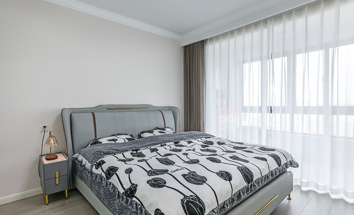 雙層落地大窗簾若隱若現,后面還配有大飄窗舒適又寬敞,讓空間不但時尚而且清爽。