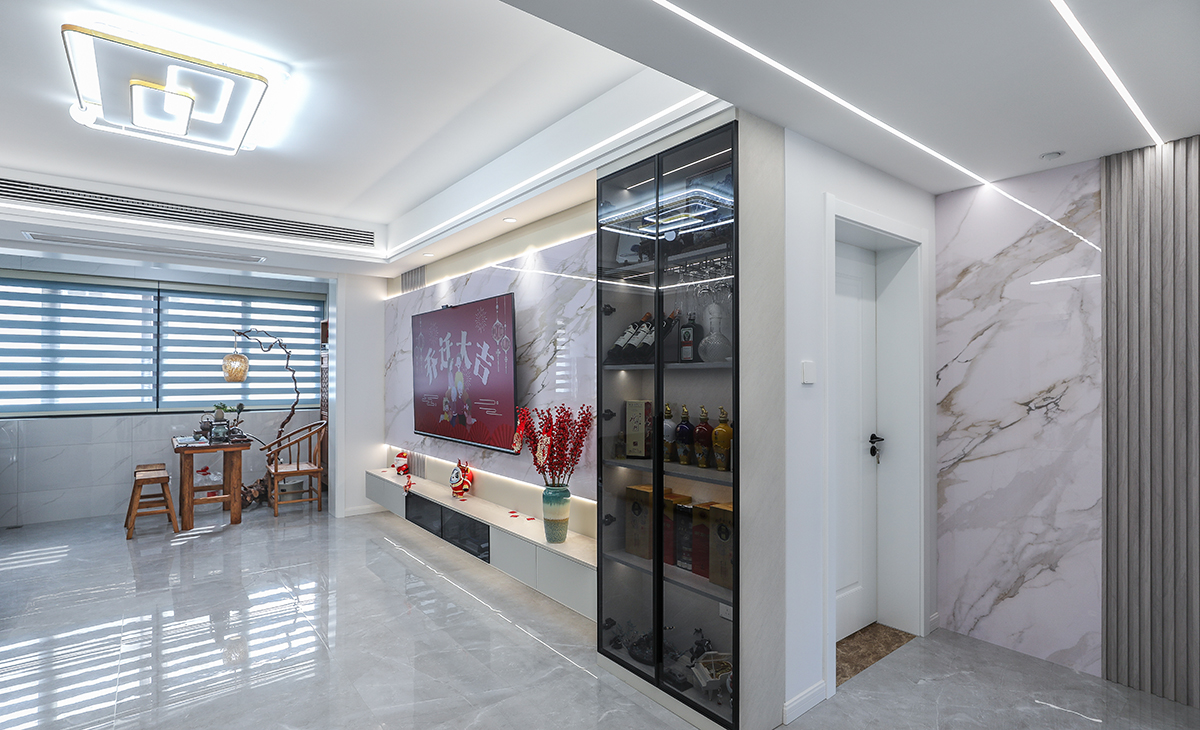 超大的巖板背景墻,頂上二個(gè)射燈點(diǎn)綴的恰到好處,加上木質(zhì)格柵的搭配給整個(gè)背景墻增加一番優(yōu)雅,電視邊柜采用透明黑色玻璃高端又大氣,電視柜也采用了懸空做法,讓空間不但時(shí)尚而且清爽。
