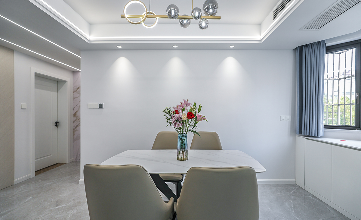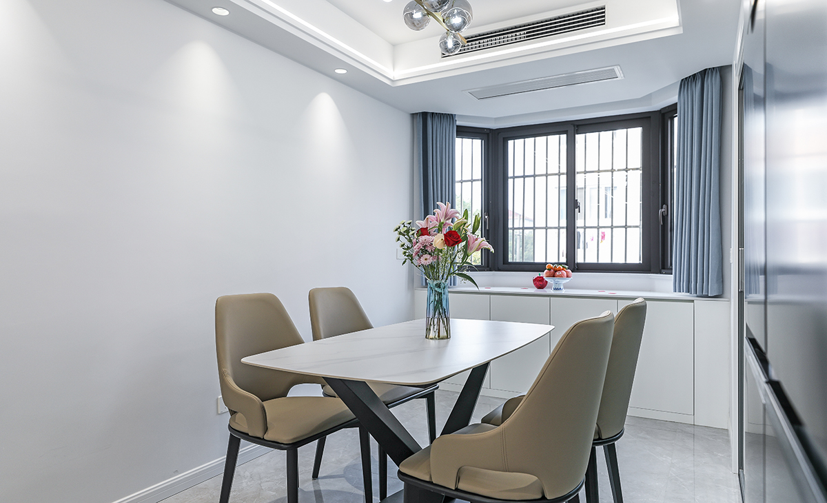 餐廳空間比較方正寬敞,又做了一個(gè)大飄窗矮柜,既實(shí)用、又有裝飾功能,冰箱為獨(dú)立位也給餐廳增加了一絲溫馨感,極窄邊框玻璃門(mén)和白色木門(mén)板相呼應(yīng),巖板餐桌把用餐氛圍調(diào)和的很溫暖,淺灰色地磚很干凈,色彩和造型上都簡(jiǎn)潔大氣。