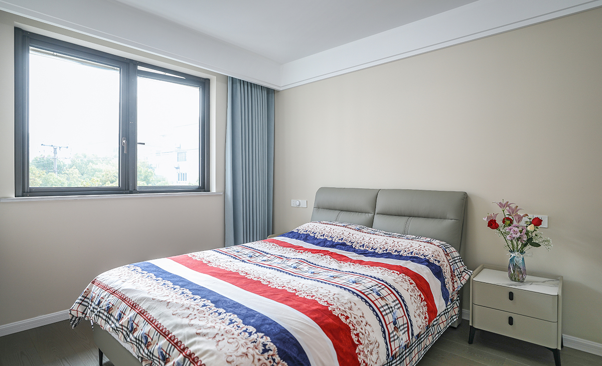 次臥為女兒房間,采用一個(gè)床頭柜做法,靠窗做轉(zhuǎn)角書(shū)桌,空間利用和功能性俱全,墻面刷奶咖色墻面乳膠漆,頂面白色乳膠漆,既簡(jiǎn)單又實(shí)用。