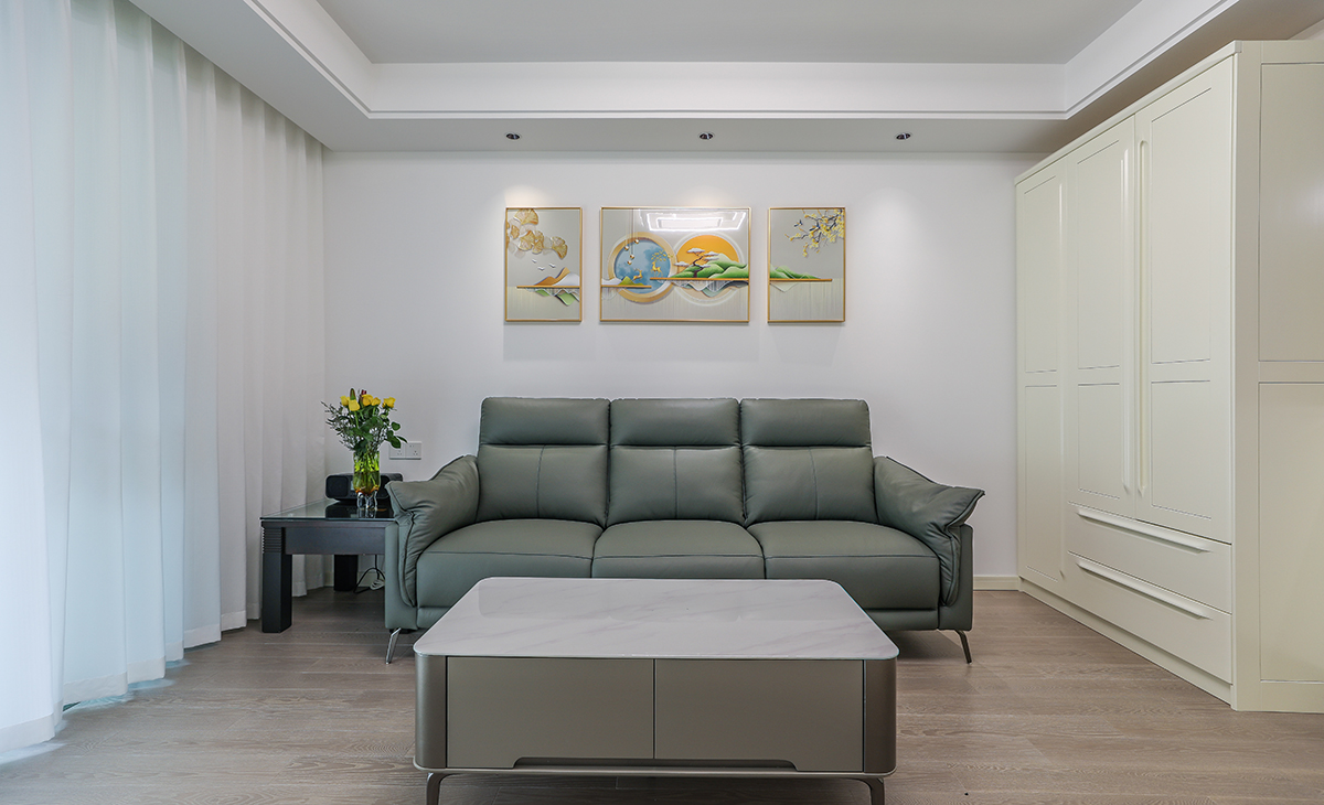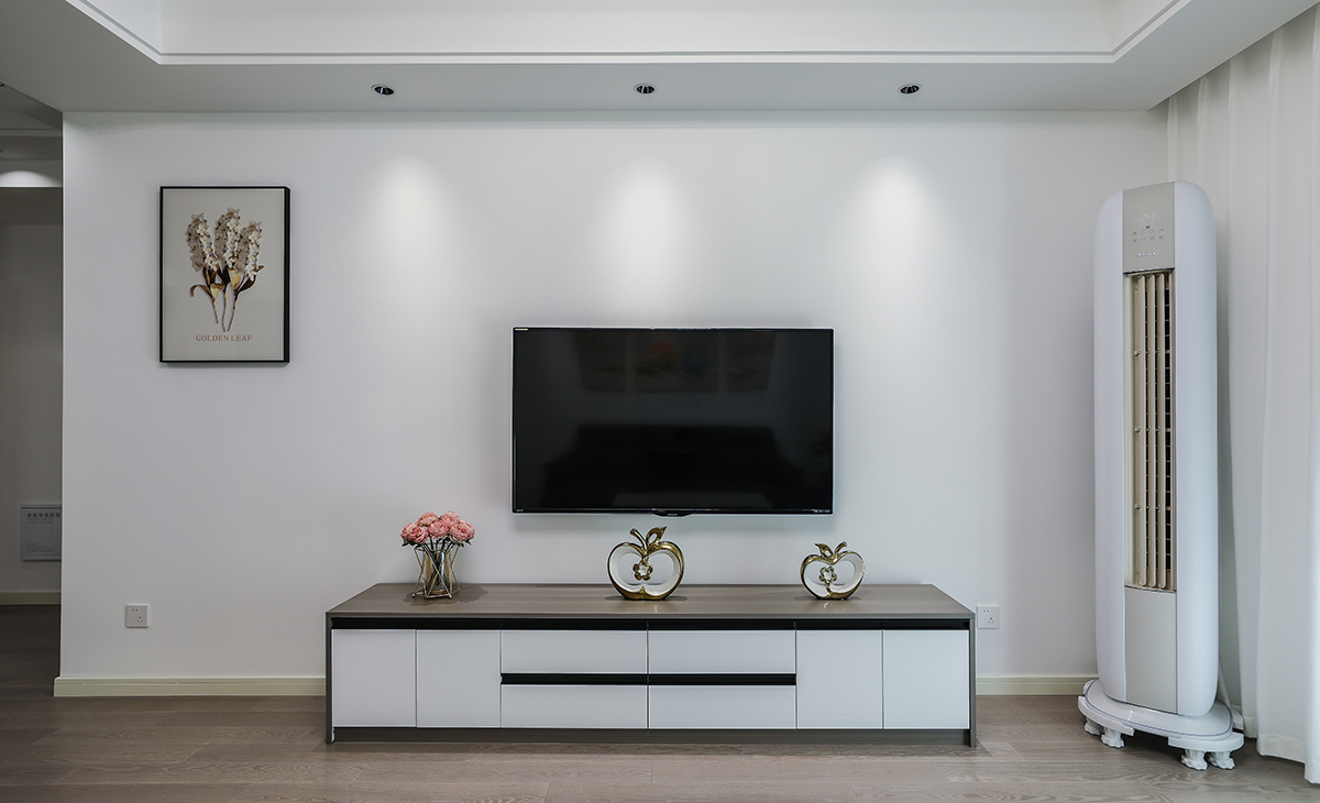 窗簾顏色和沙發(fā)相呼應(yīng),和白色陽臺門套相配襯,電視柜與茶幾的裝飾,讓空間活躍很多,通長電視柜也很大氣,沙發(fā)后搭配的壁畫,讓整個空間呈現(xiàn)一種欣欣向榮的感覺。