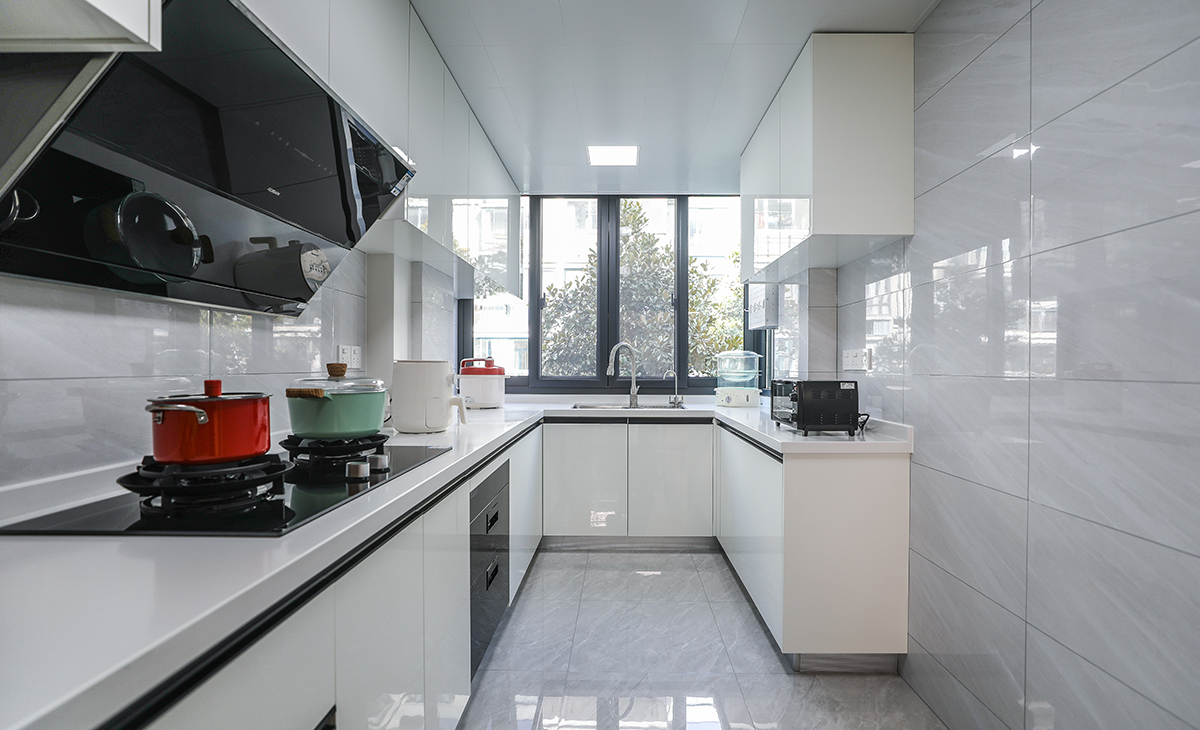 該套房子廚房空間較大,U型三面櫥柜,采用高光pet門板,顏色簡潔明快,材質(zhì)干凈和好打理,白色的吊頂和白色的上、下櫥柜相呼應(yīng),石英石臺面干凈、好打理,各種廚房電器全部配齊,滿足主人制作各種美食的需求。