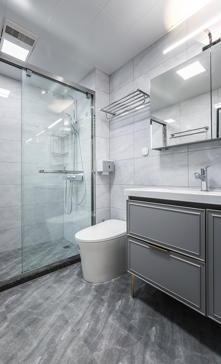 主衛(wèi)生間不大,不銹鋼本色淋浴房邊框、白色馬桶,墻地一體柔光磚、白色吊頂,長虹玻璃鈦合金開門,體現(xiàn)主人高檔次的生活品味和優(yōu)雅的審美觀。