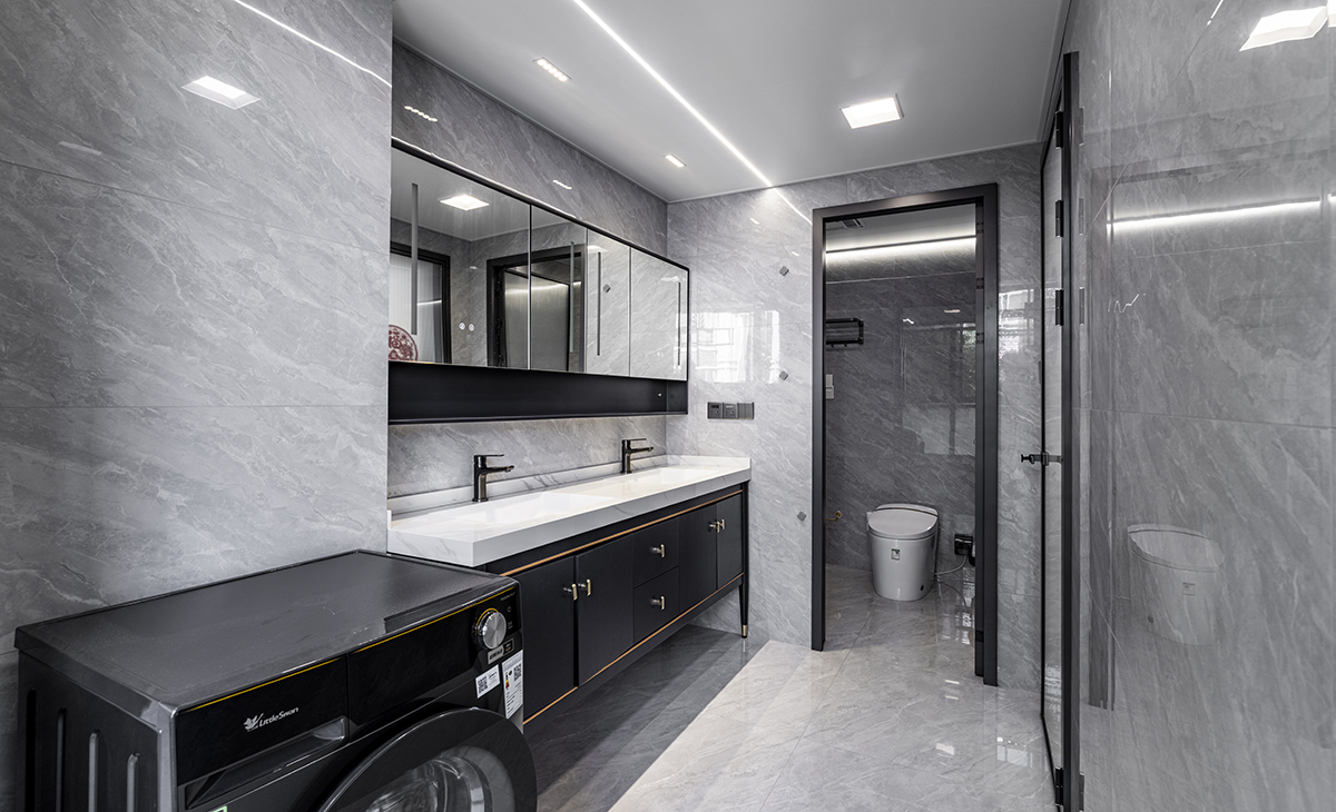 樓上衛生間的干區設計了雙臺盆,滿足兩個人同時洗漱,深色實木臺盆和槍灰色鈦合金門套相搭,空間整體很協調、很自然。
