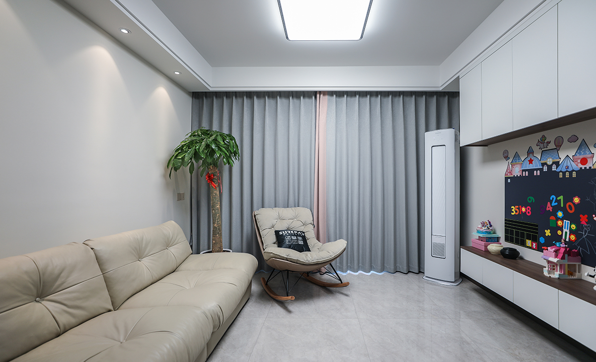 沙發(fā)背景刷米白色涂料,搭配白色的沙簾和高級(jí)灰的窗簾,沙發(fā)背景留白設(shè)計(jì),色調(diào)上墻面涂料和沙發(fā)用淺色,窗簾用深色,深淺搭配的錯(cuò)落有致,既溫馨又簡(jiǎn)潔。