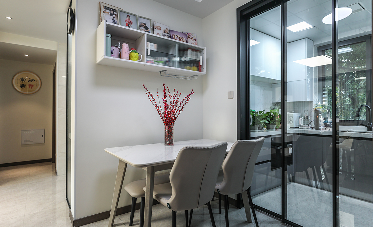 餐廳空間比較方正寬敞,聯(lián)通廚房的位置做三聯(lián)動(dòng)推拉移門,放大了空間感,靠墻做嵌入式冰箱,既實(shí)用、又有裝飾功能,原木色框架和白色木門板相呼應(yīng),巖板餐桌把用餐氛圍調(diào)和的很溫暖,淺灰色地磚很干凈,色彩和造型上都簡(jiǎn)潔大氣。