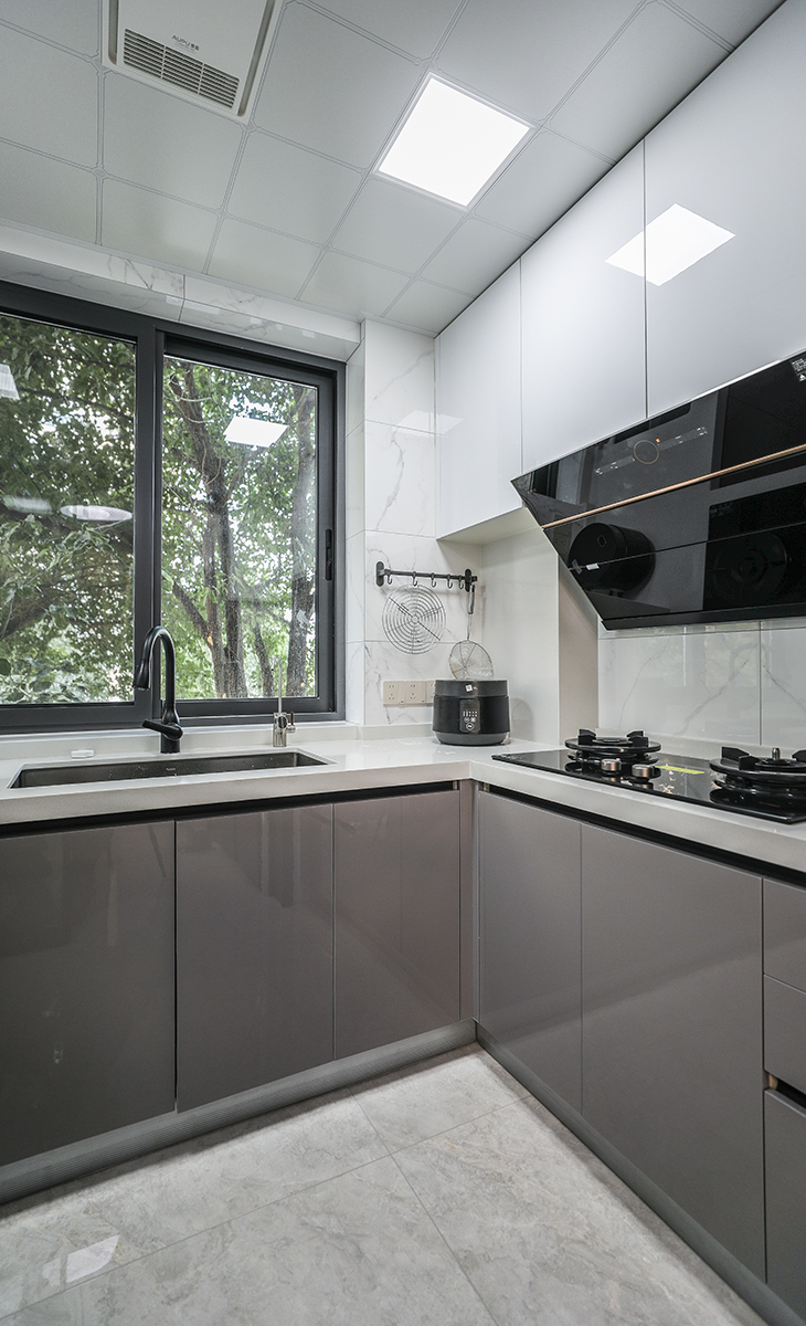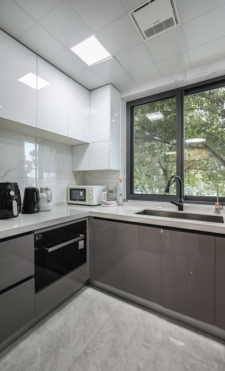 該套房子廚房空間很大,U型臺(tái)面三面櫥柜,兩面吊柜,滿足了儲(chǔ)物功能,又不遮擋視線,顏色簡(jiǎn)潔明快,材質(zhì)要干凈和好打理,白色的吊頂和米色的櫥柜相呼應(yīng),石英石臺(tái)面經(jīng)久耐用,各種廚房電器全部配齊,滿足主人制作各種美食的需求。