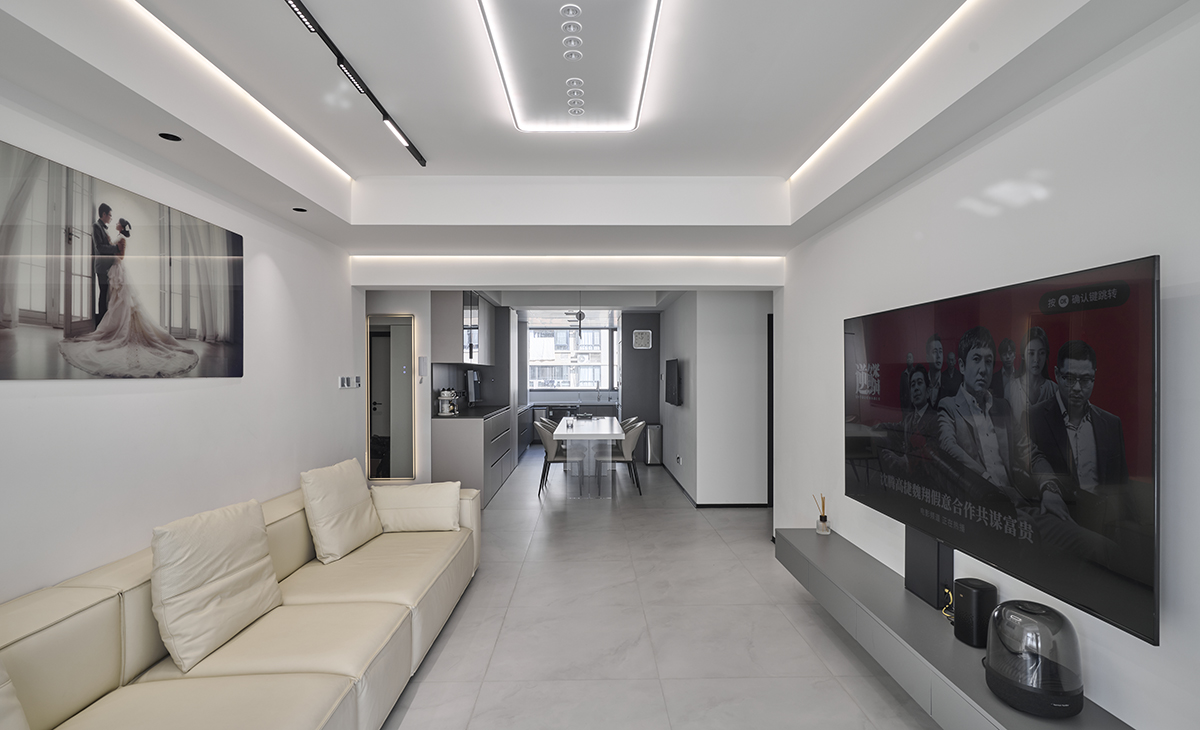 頂面燈光很豐富,有吸頂主燈,輔助燈明裝磁吸軌道燈,燈帶和射燈作為氛圍燈,沙發背景掛一幅主人的婚紗照,把現代極簡風格詮釋的淋漓盡致。