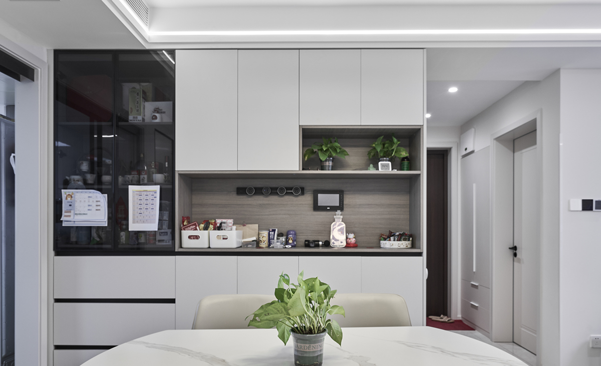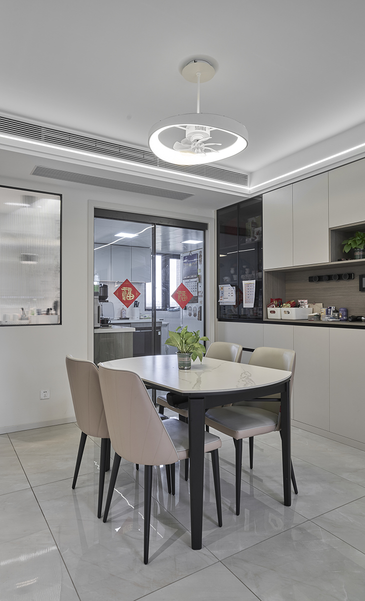 餐廳空間比較方正寬敞,靠墻做一組裝飾酒柜,既實用、又有裝飾功能,巖板餐桌把用餐氛圍調和的很溫暖,淺灰色地磚很干凈,色彩和造型上都簡潔大氣。