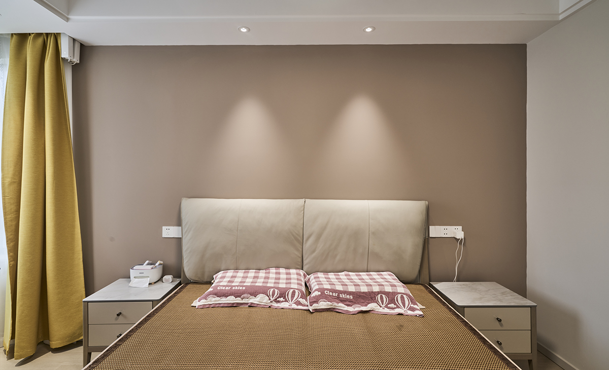 主臥鋪的暖灰色地板,背景墻咖色,這樣和地板進行搭配,就不會那么突兀,吊頂做雙眼皮,配合上背景墻燈,整體造型以簡潔平板為主,方便打理,體現了簡約風格的簡潔、隨意,不拘一格。
