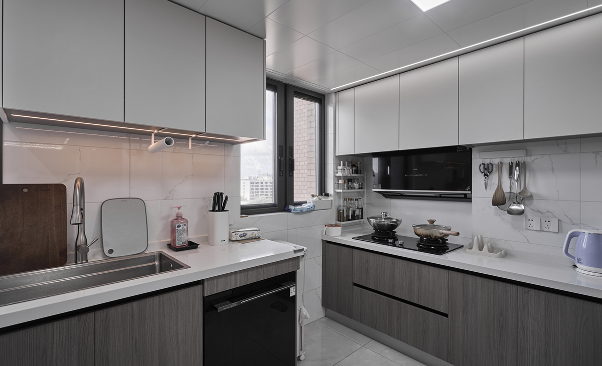 廚房空間很大,U型兩面櫥柜,顏色簡潔明快,材質要干凈和好打理,白色的吊頂和高光的的灰色櫥柜相呼應,石英石臺面干凈清爽,各種廚房電器全部配齊,滿足主人制作各種美食的需求。