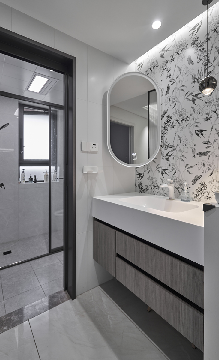 衛生間空間很大,1米長的洗手臺,智能馬桶,墻地一體磚、白色吊頂,鈦合金移門,體現主人高檔次的生活品味和優雅的審美觀。