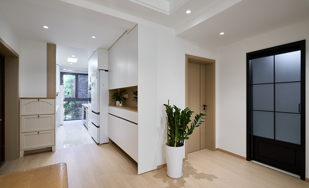 進門玄關柜很大,中間漏空放綠植、下方漏空放鞋,旁邊就是嵌入式冰箱,可以充分利用儲物空間,淺灰色套裝門和踢腳板,空間很寬敞。