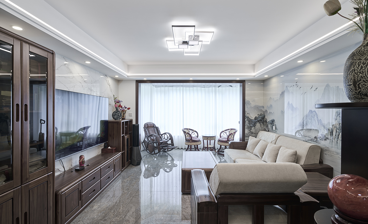 客廳是接待客人的空間、是家庭裝修的亮點所在、也是一家人活動頻率最高的區域,米色皮質沙發和白色山水畫巖板相呼應,體現高端華貴,吊頂造型上采用方形石膏板+雙眼出線型燈,實木電視柜和茶風、條幾上放一裝飾擺件。地面采用灰色玻化地磚。造型和色調上無不體現新中式風格的厚重和高貴。