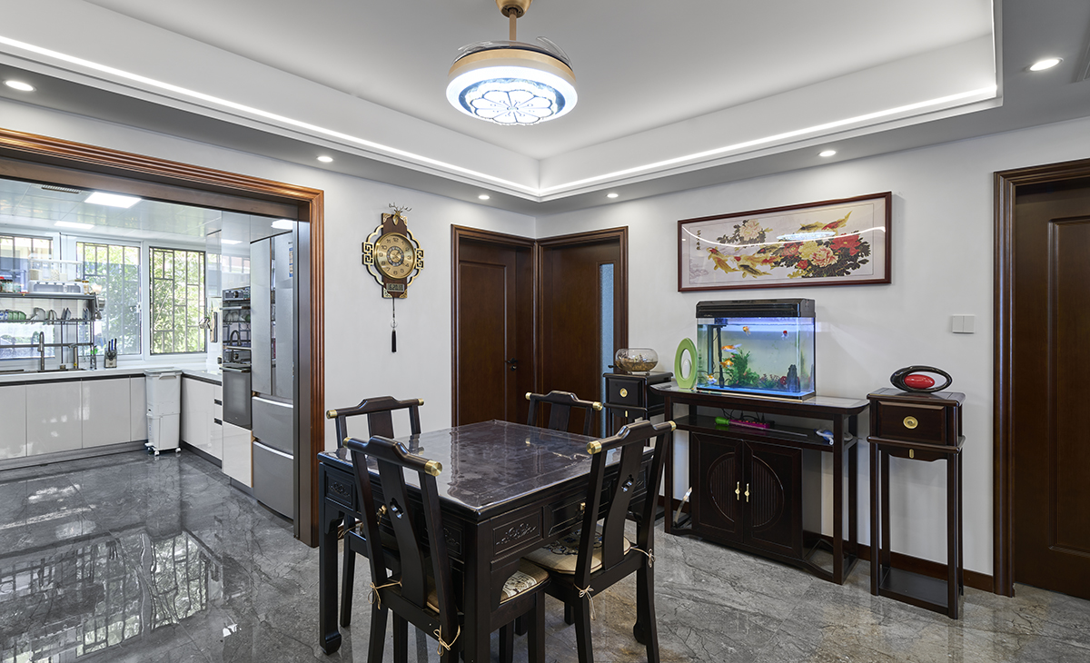 餐廳采用實木方桌,中式玄關,中式餐邊柜,體現中式風格的簡潔時尚,方正大氣、矮柜上的魚缸很有仙氣,頂面中式吊燈,配上線型燈,讓空間溫馨、大氣。