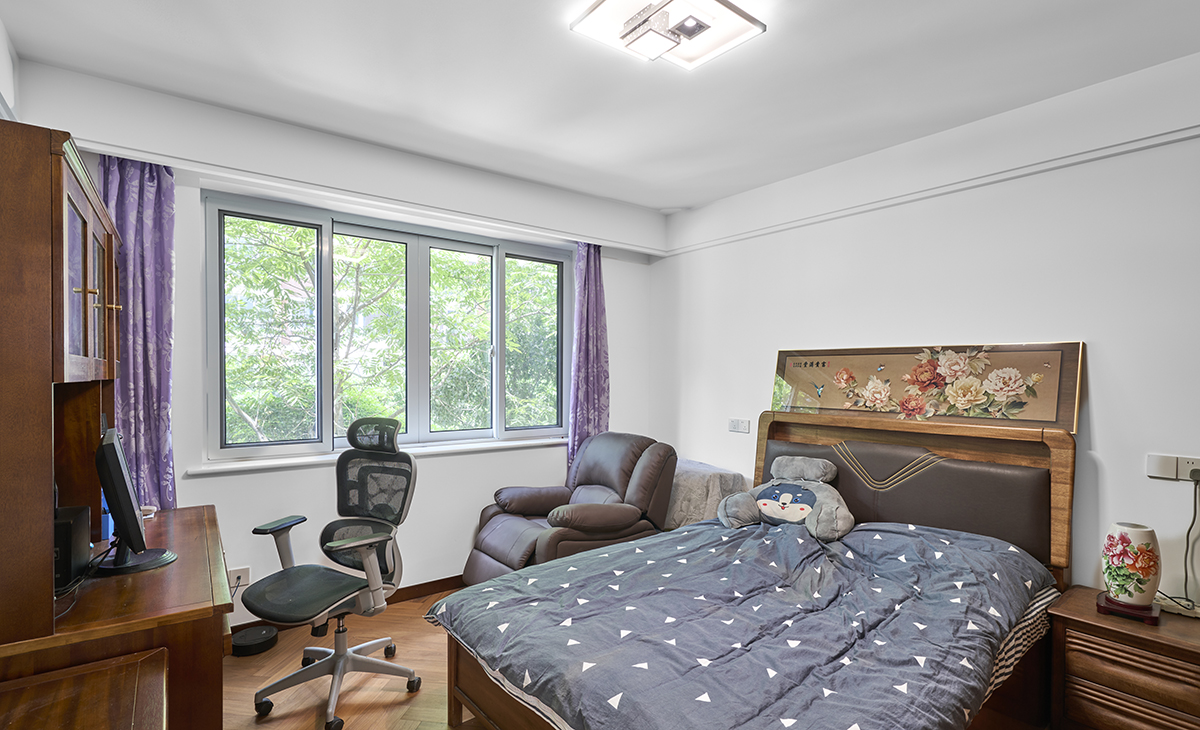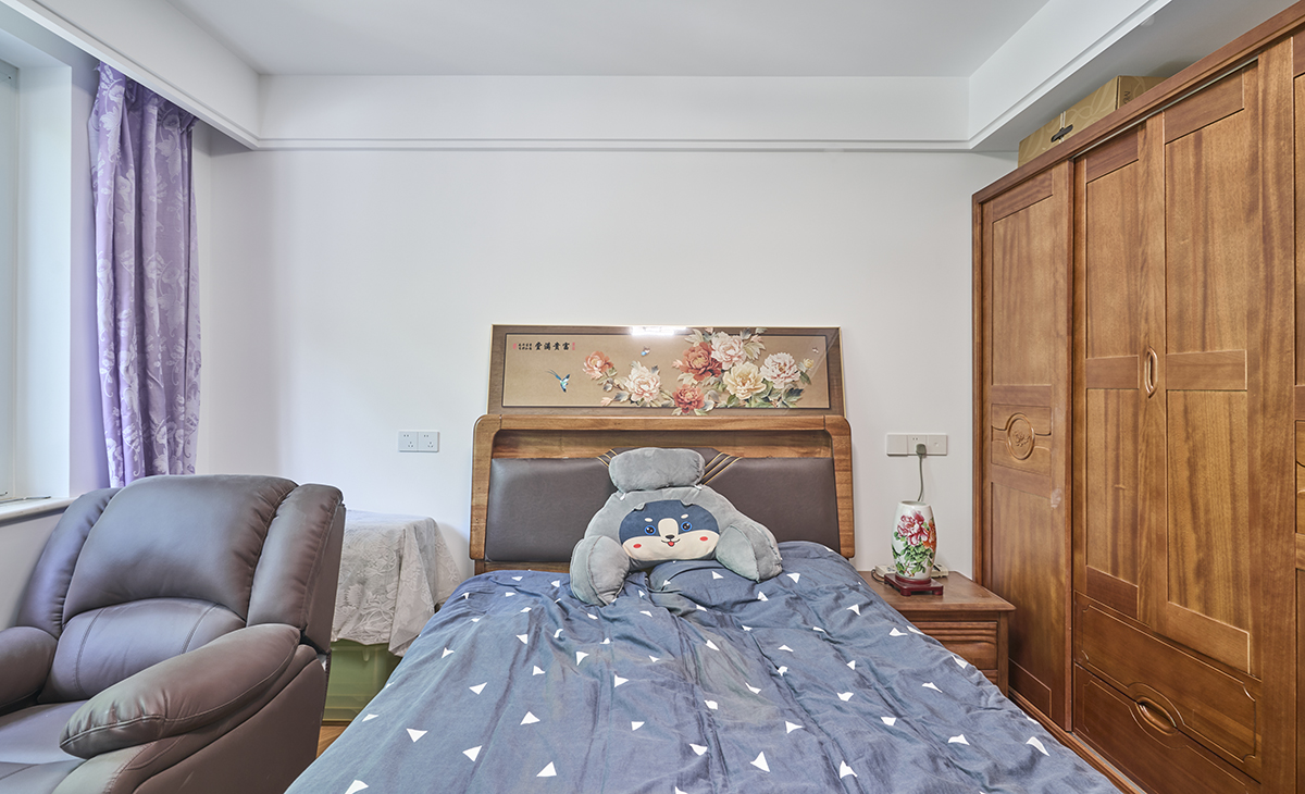 次臥作為多功能室,主要供叔叔阿姨當書房用,偶爾子女過來也能小住,床邊上有一個沙發,讓叔叔累了可以放松一下。