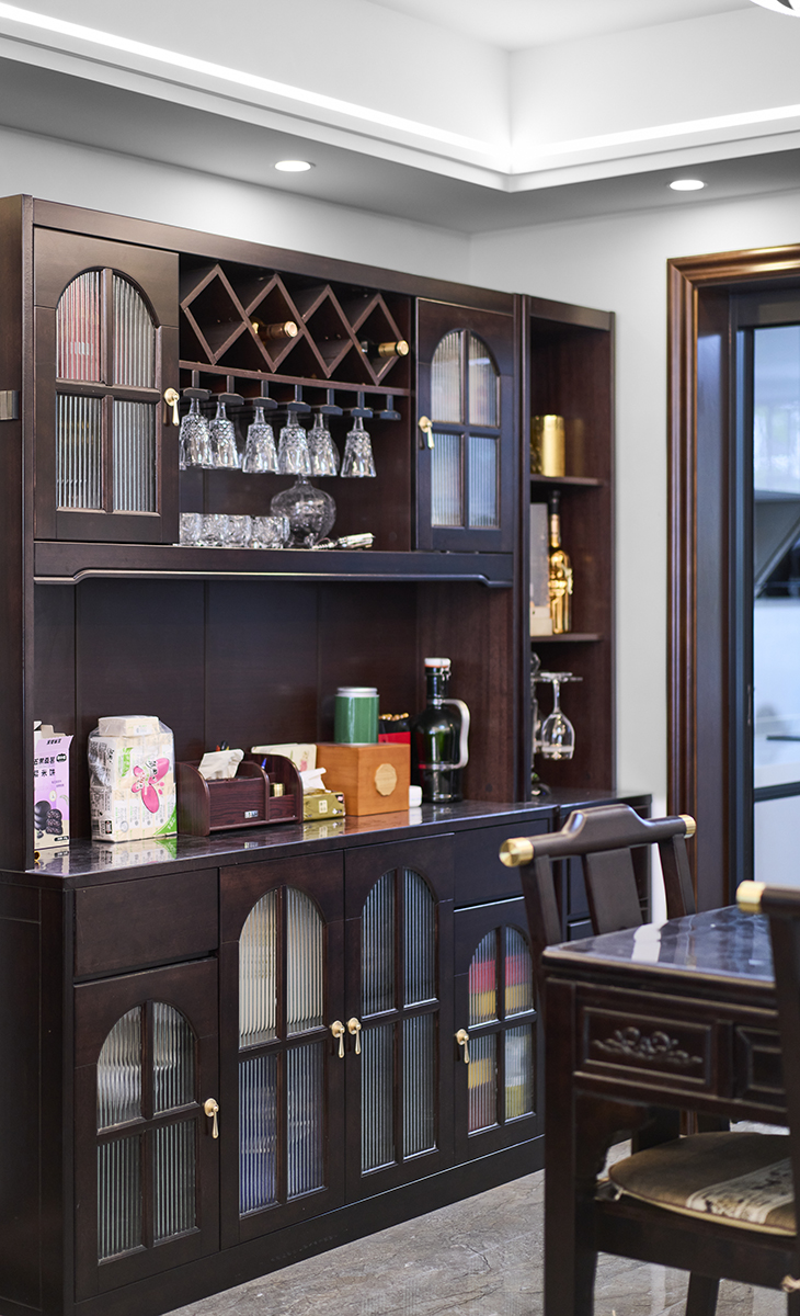 中式玄關,中式餐邊柜,中式吊燈,深色地磚,整潔干凈,方便打理,餐桌頂面吊燈是一大亮點,把空間點綴地恰到好處。