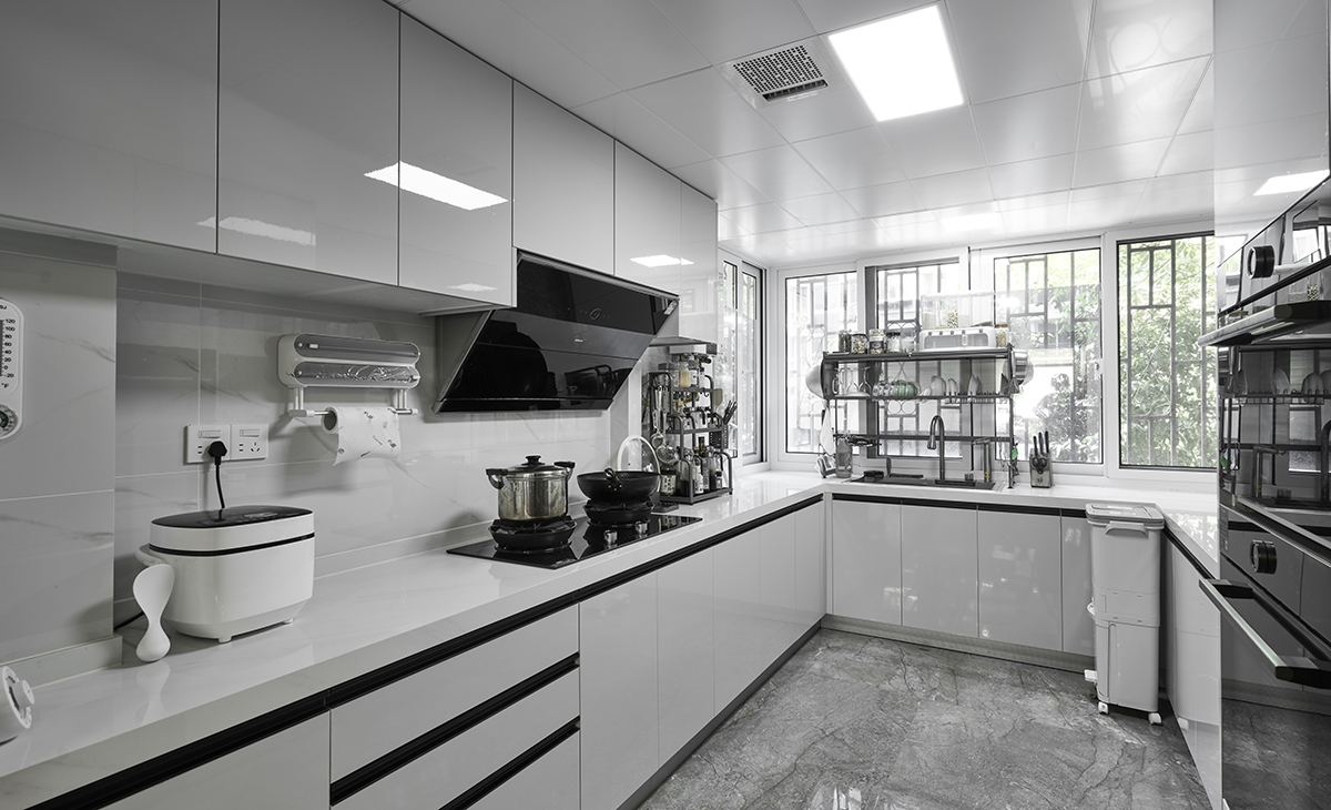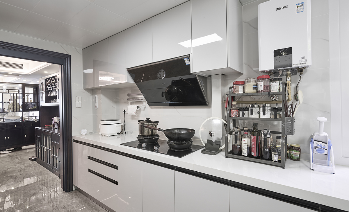 該套房子廚房空間很大,U字型櫥柜,洗碗機、蒸烤箱,微波爐等電器全配,兩排6個抽屜,上下柜都是白色,臺面白色,方便打理,墻地磚的顏色和櫥柜顏色搭配地很自然,客戶不斷地夸贊設計師對色彩的精準把握。