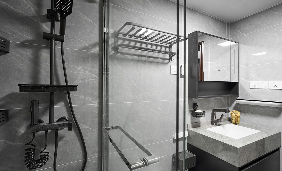 客衛淺灰色墻地磚,槍灰色臺盆柜,白色石英石臺面、槍灰色龍頭,智能馬桶,體現了客戶的高檔生活品質。